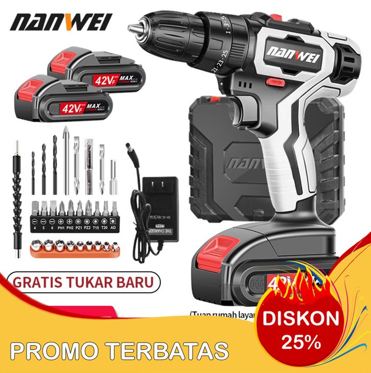 NANWEI - Mesin Bor Cordless/Bor Baterai/ Bor Listrik/Beton Besi Kayu Full 42VF Set Pilihan Bor Tanpa Ka