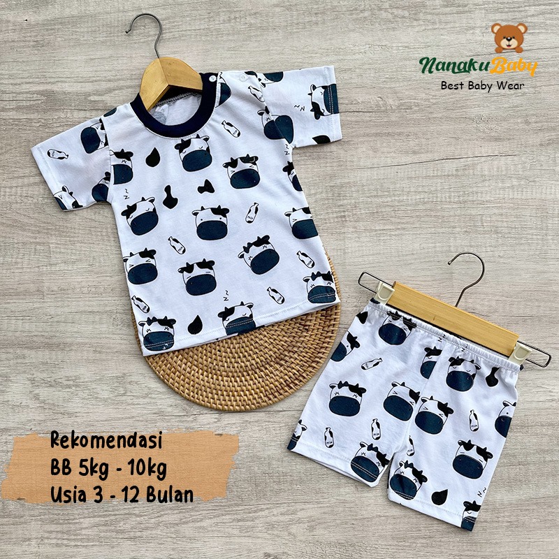 Nanaku Baby - Setelan Baju Bayi Laki Laki & Perempuan Model Tangan Pendek Kancing Bahu Usia 3-12 Bulan Motif Sapi