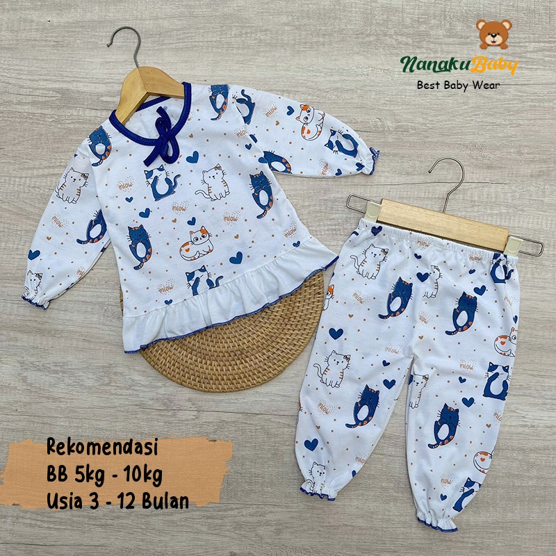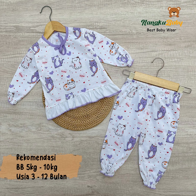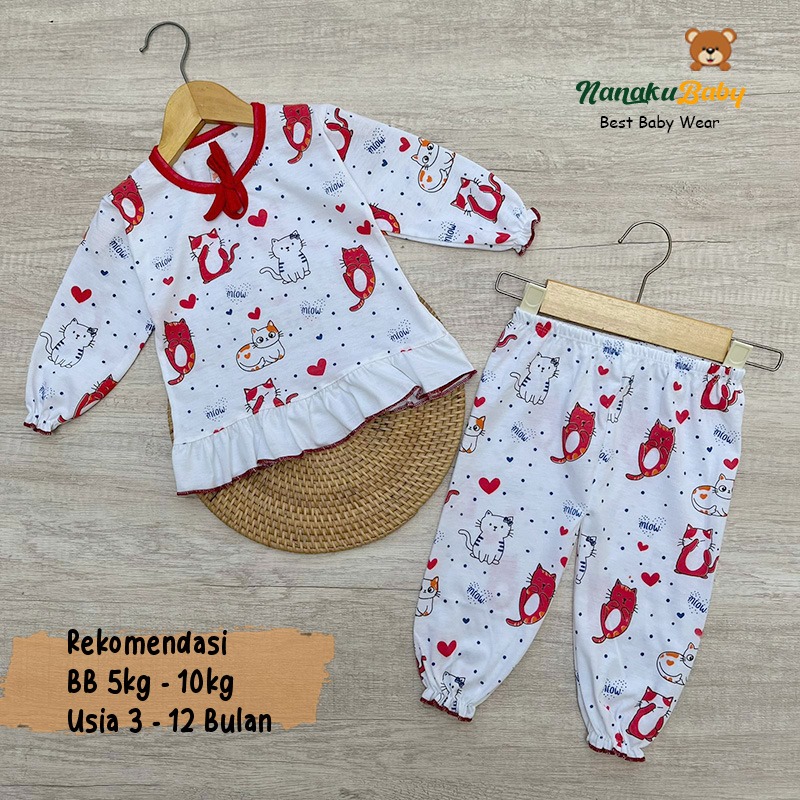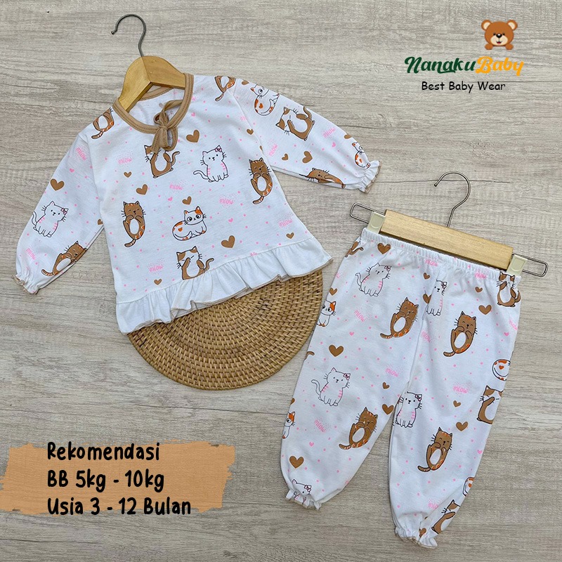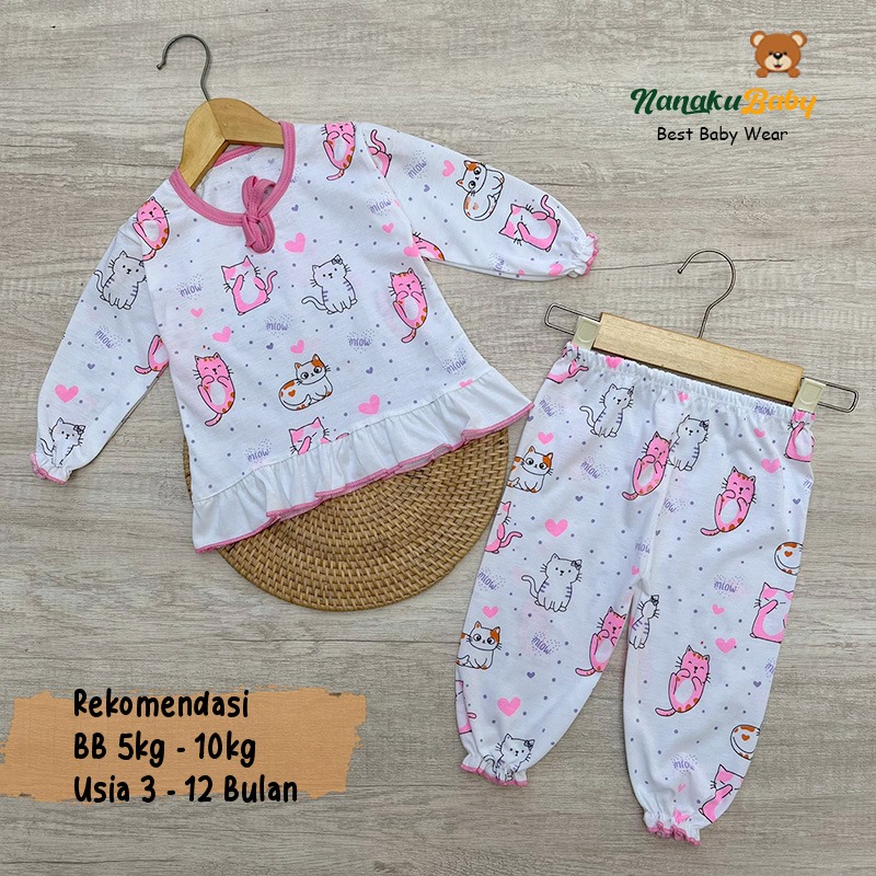 Nanaku Baby - Setelan Baju Bayi Perempuan Model Tangan Panjang Usia 3-12 Bulan Motif Sleep Cat