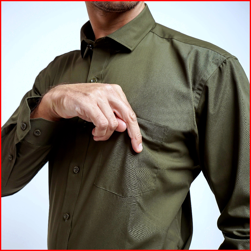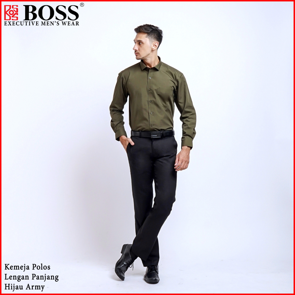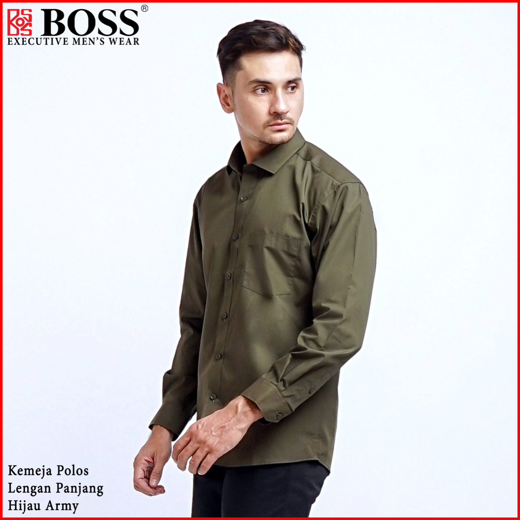 Boss Kemeja Polos Pria Lengan Panjang Hijau Army