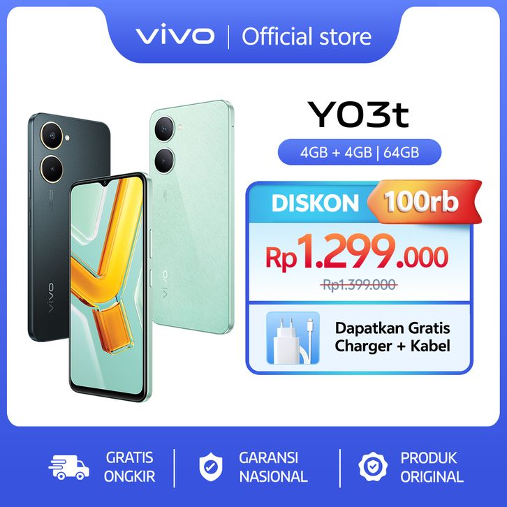vivo Y03t (4+64) - IP54 Tahan Air, AI Dual Camera 5000mAh + 15W FlashCharge, Layar Sunlight 90Hz