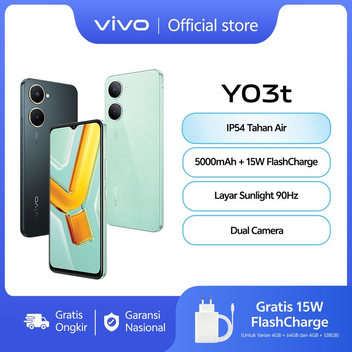 vivo Y03t - IP54 Tahan Air, AI Dual Camera 5000mAh + 15W FlashCharge, Layar Sunlight 90Hz