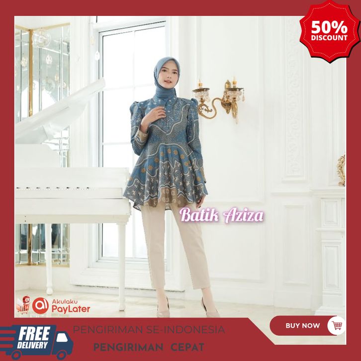 ATASAN BATIK WANITA BLUS BATIK PUFFY SHOULDERS MODEL PEPLUM PAYUNG BLUS MUTIARA BIRU HIJAU BY BATIK AZIZA