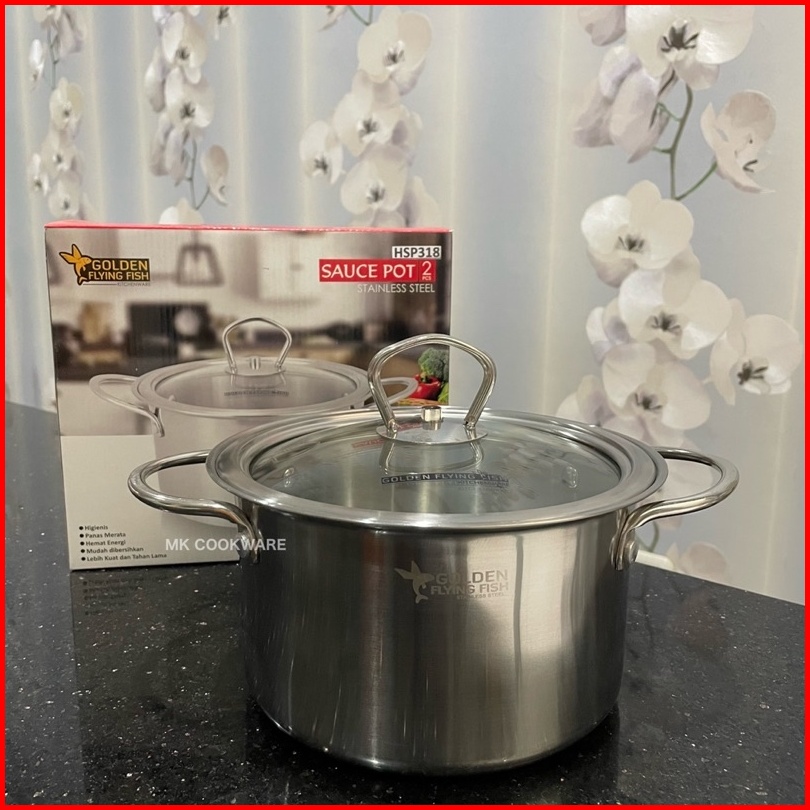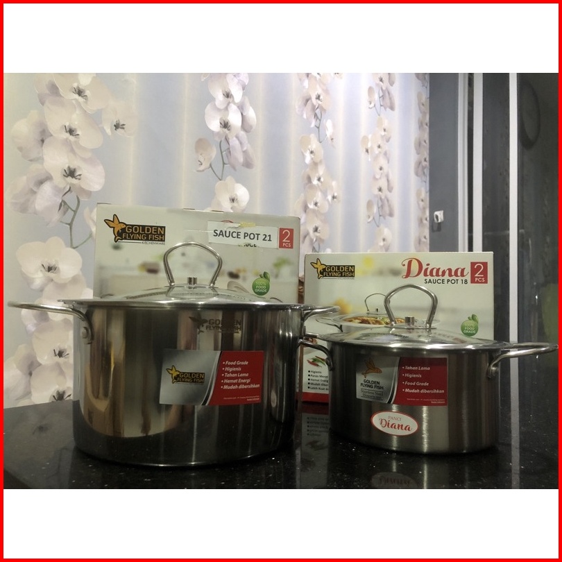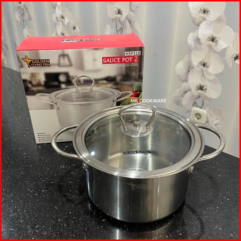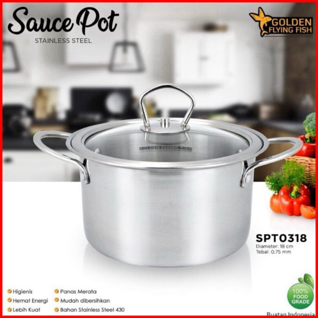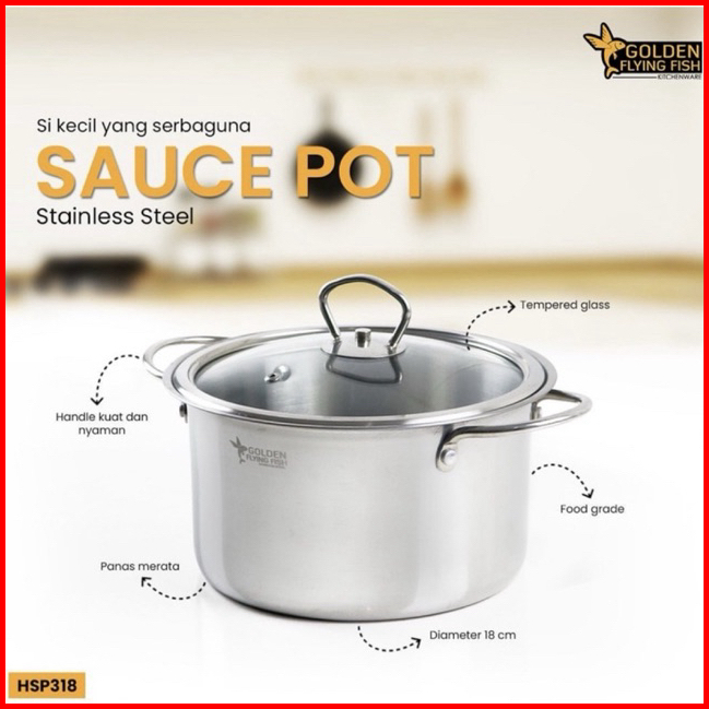 Golden Flying Fish - Panci Sauce Pot Stainless Steel 18 Cm - Panci Diana Stainless Steel Tutup Kaca Hsp318 Spt0318 - Tem