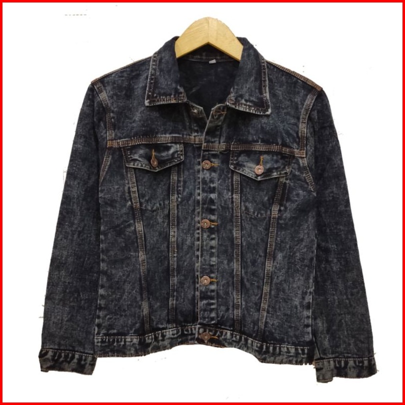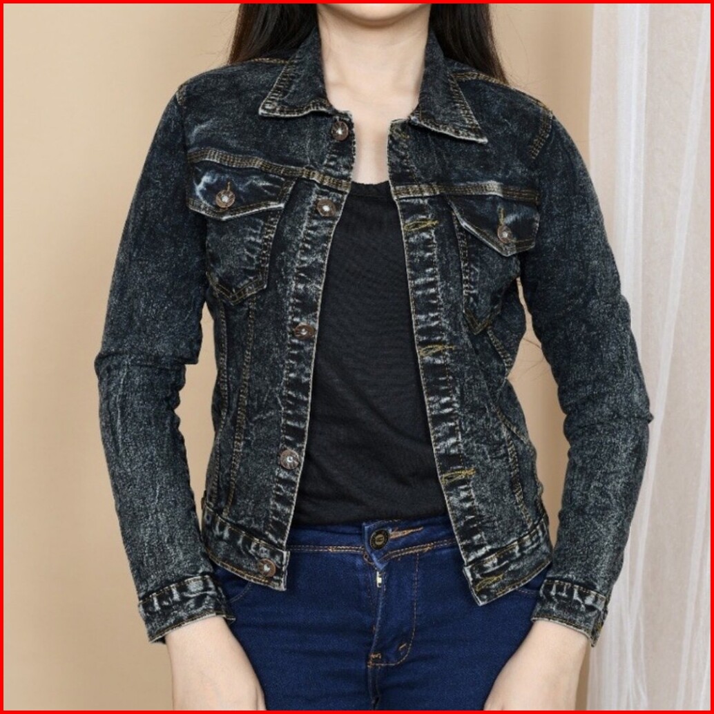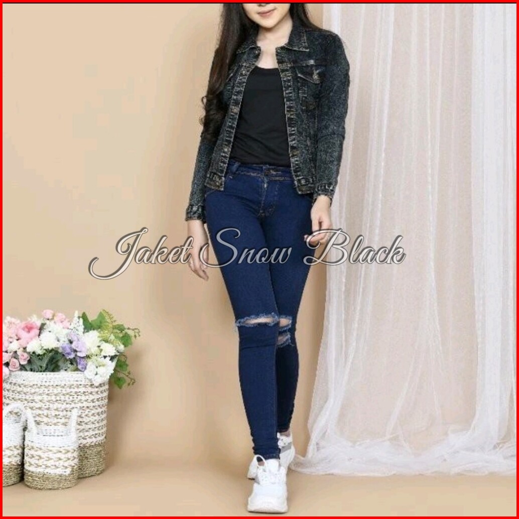 Jaket Jeans Wanita Hitam Snow Kancing Terbaru Kekinian Murah