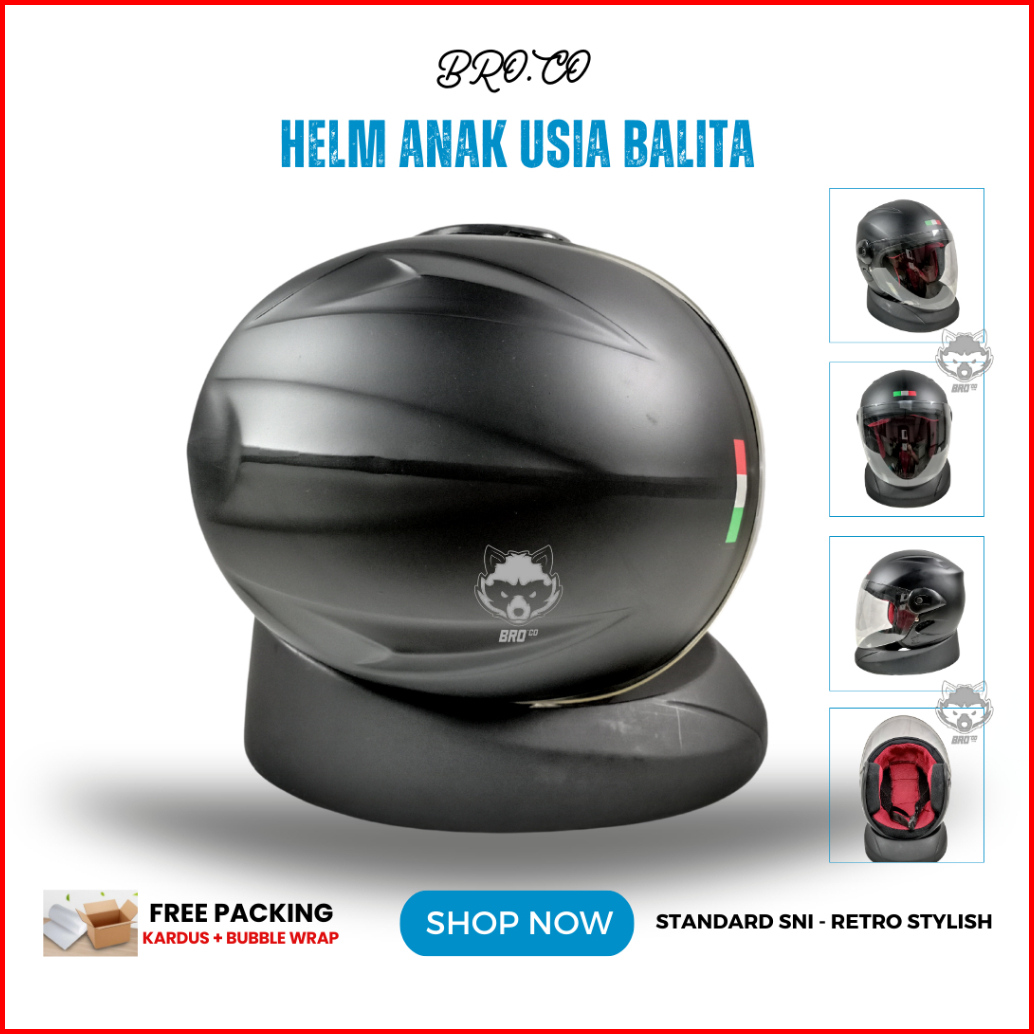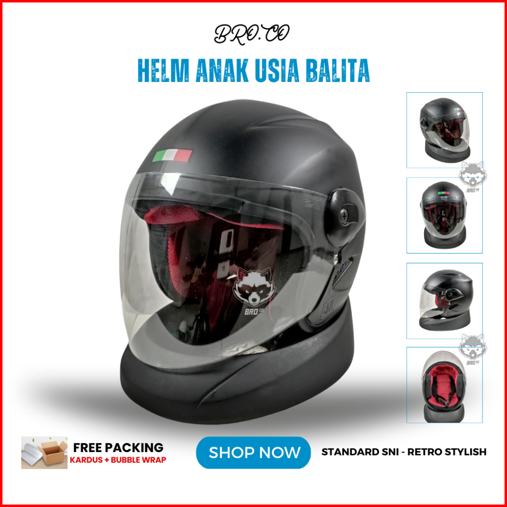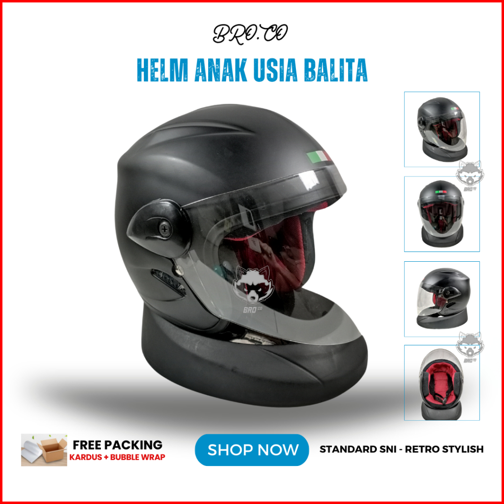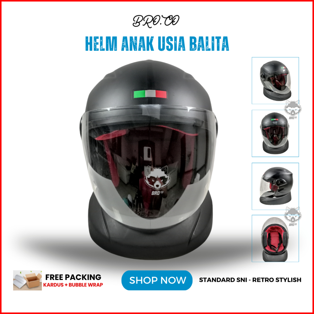 Helm Pilot Retro Italy Anak Anak Junior Half Face Black Hitam Doff Standard Sni Premium Brokids Bro.co Untuk Laki-laki D