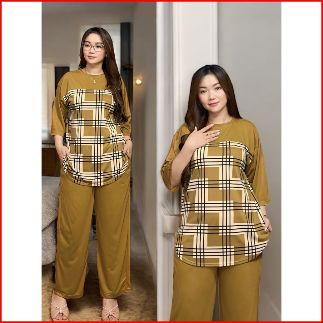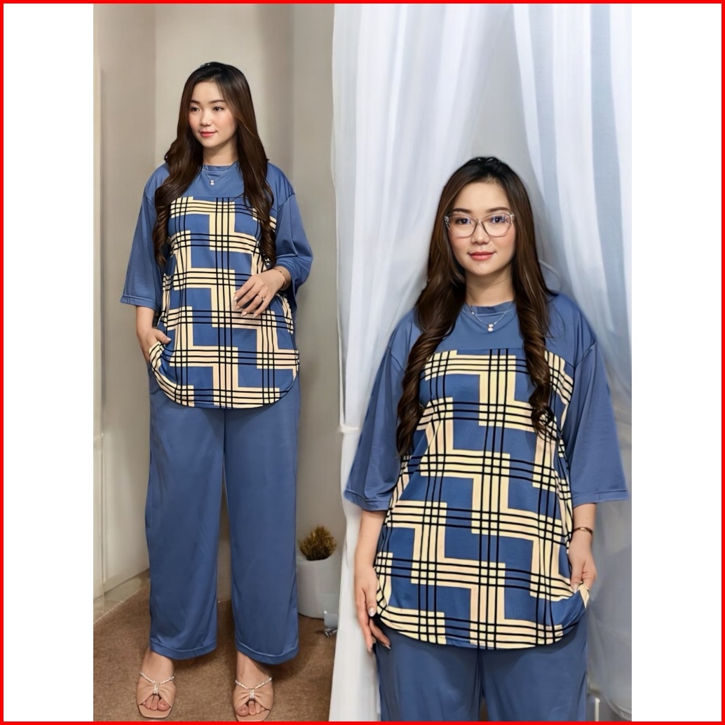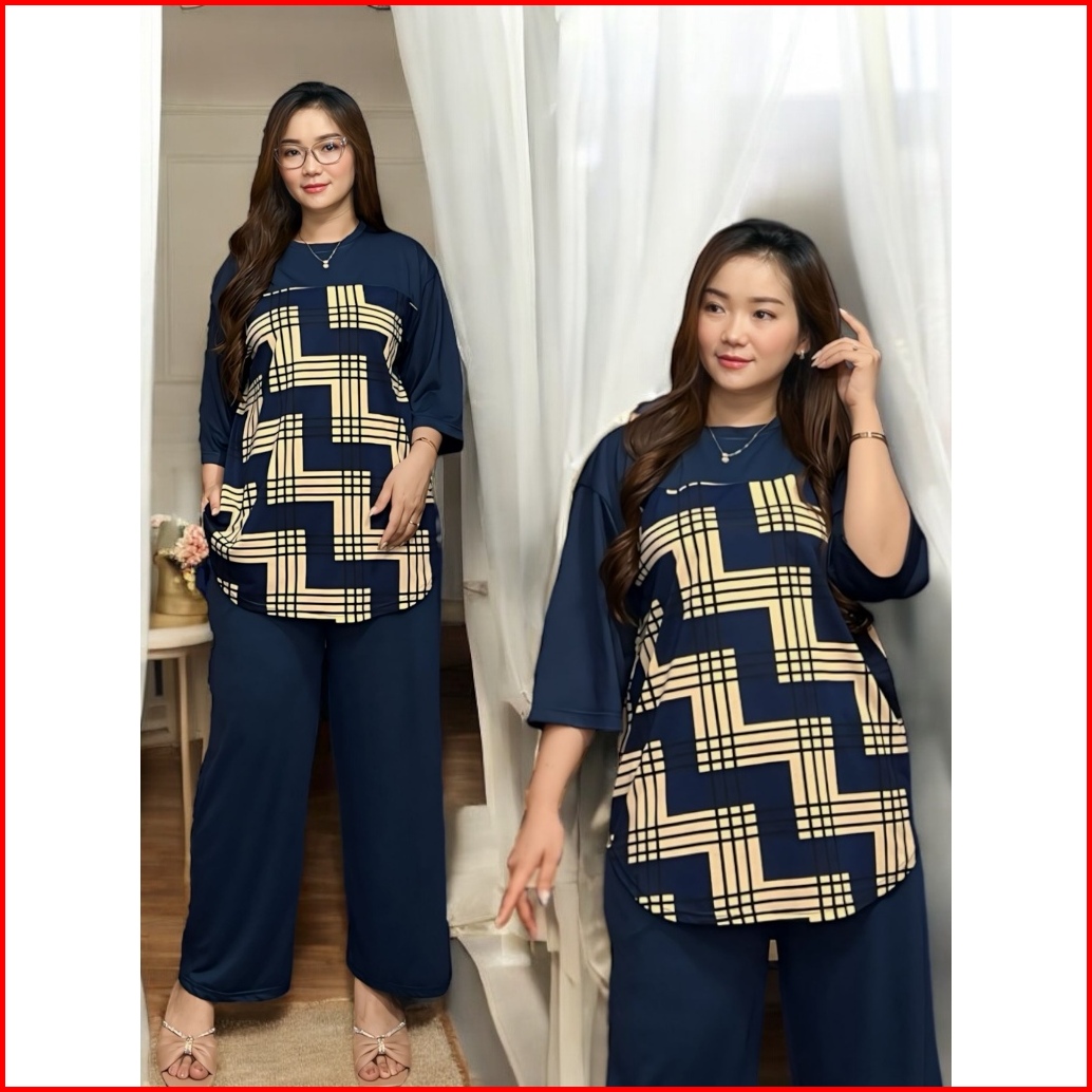 Setelan Wanita Oversize Kekinian Ld 120 Cm Motif Full Print Atasan Model Oval Lengan 3 4 Dan Celan Panjang Oneset Casual