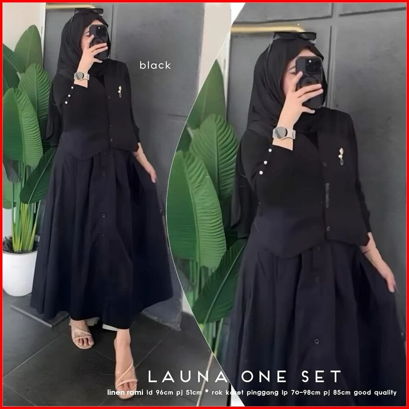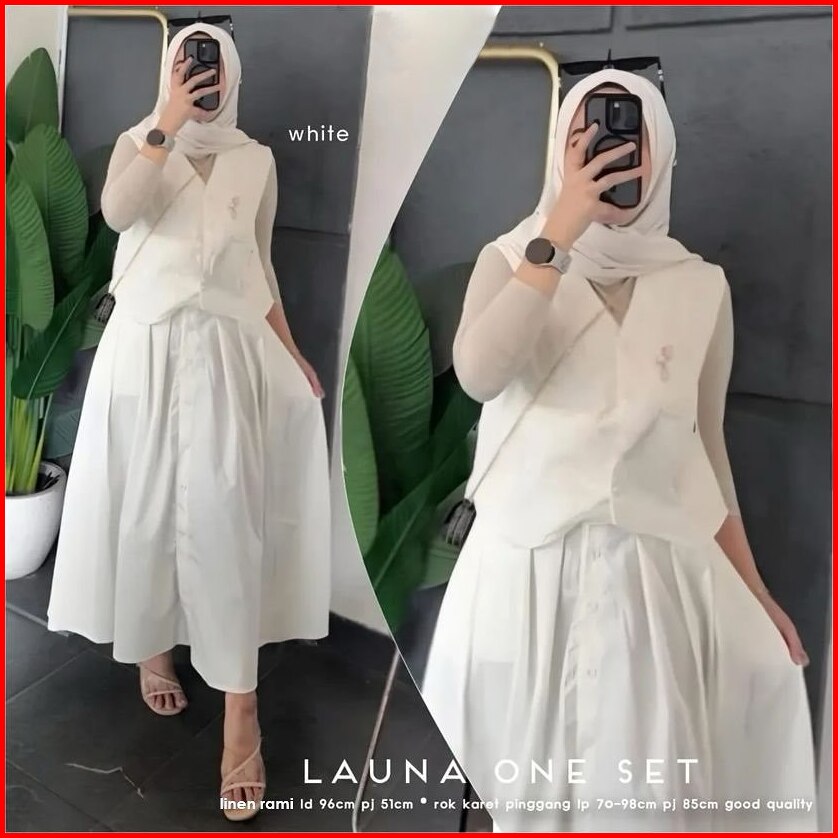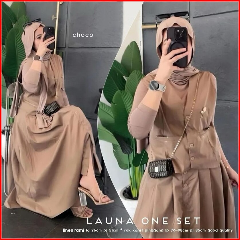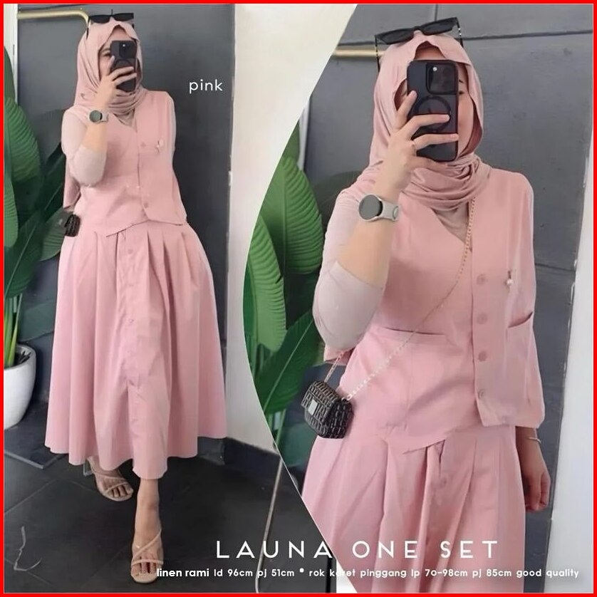 Launa Set 2in1 Bahan Linen Rami Setelan Wanita Kekinian One Set Terbaru Atasan Dan Rok Elf