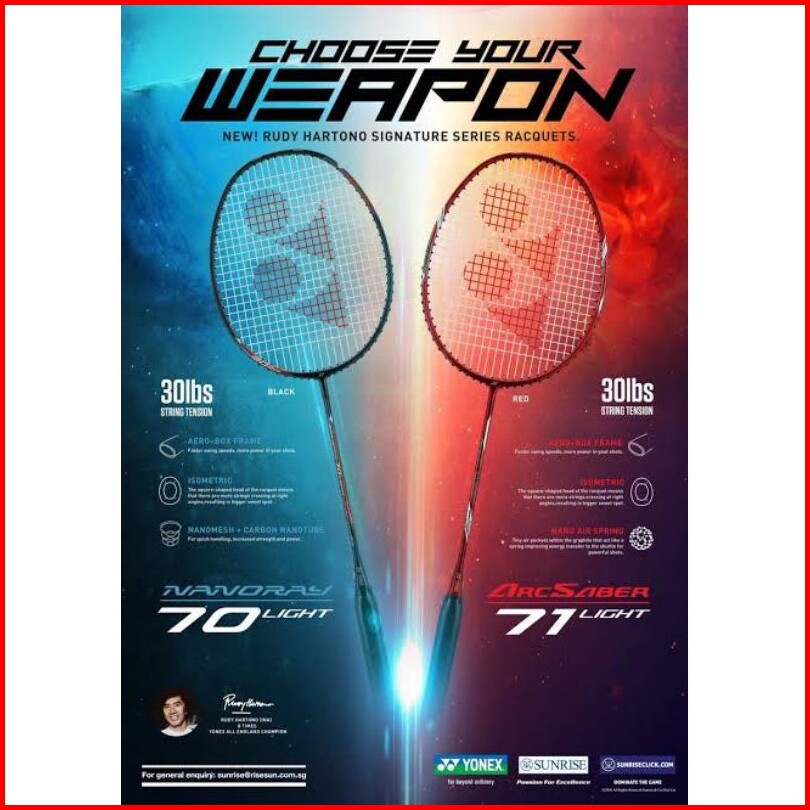 Raket Badminton Yonex Nanoray 70 Light Rudi Hartono Series - Tension 30 Lbs - Orginal Yonex Sunrise Made In China