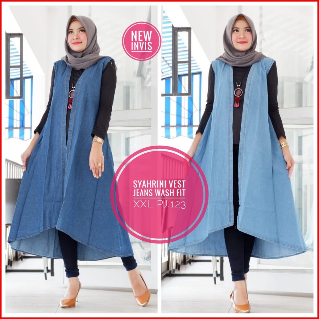 Long Outer Rompi Wanita Panjang Denim Jeans Wash Syahrini Vest