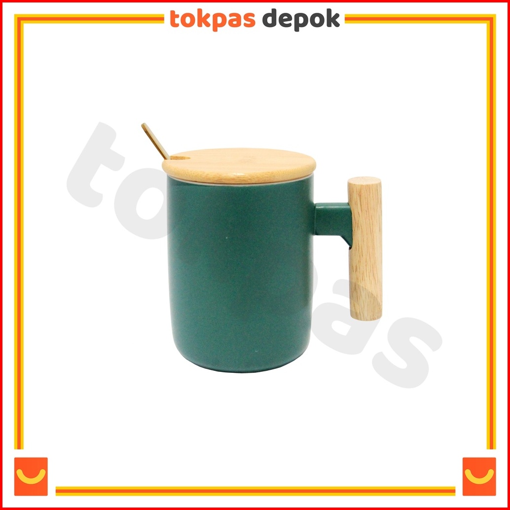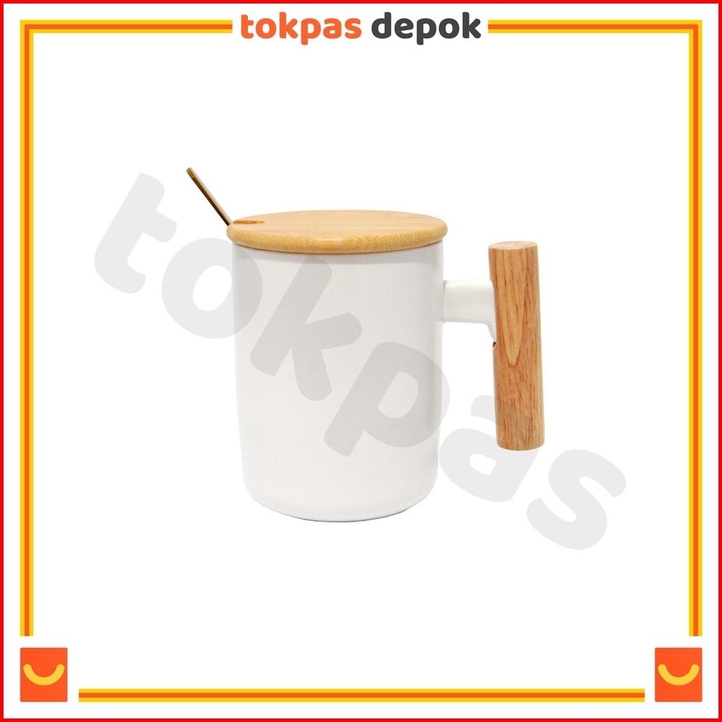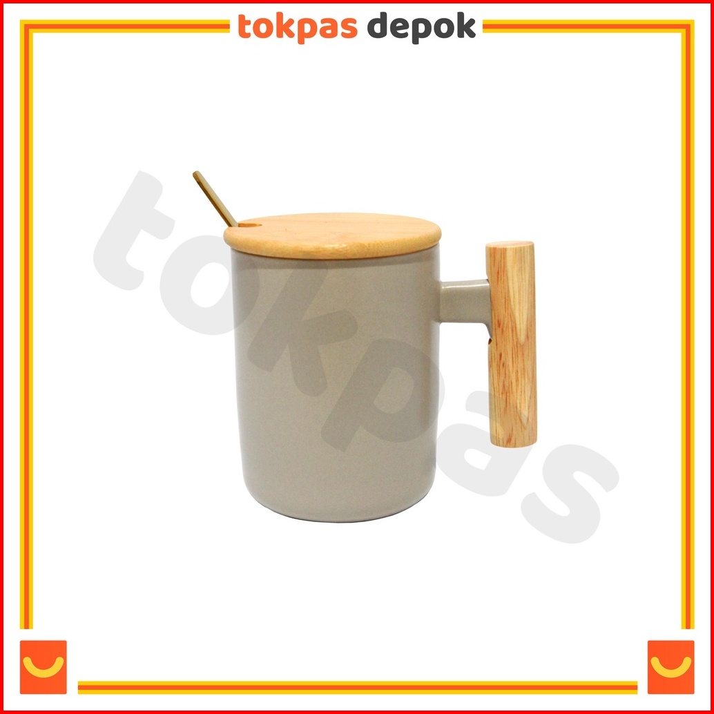 Mug Gagang Kayu Cangkir Teh Kopi Keramik Minimalis Yuka Dengan Tutup Dan Sendok Im-066