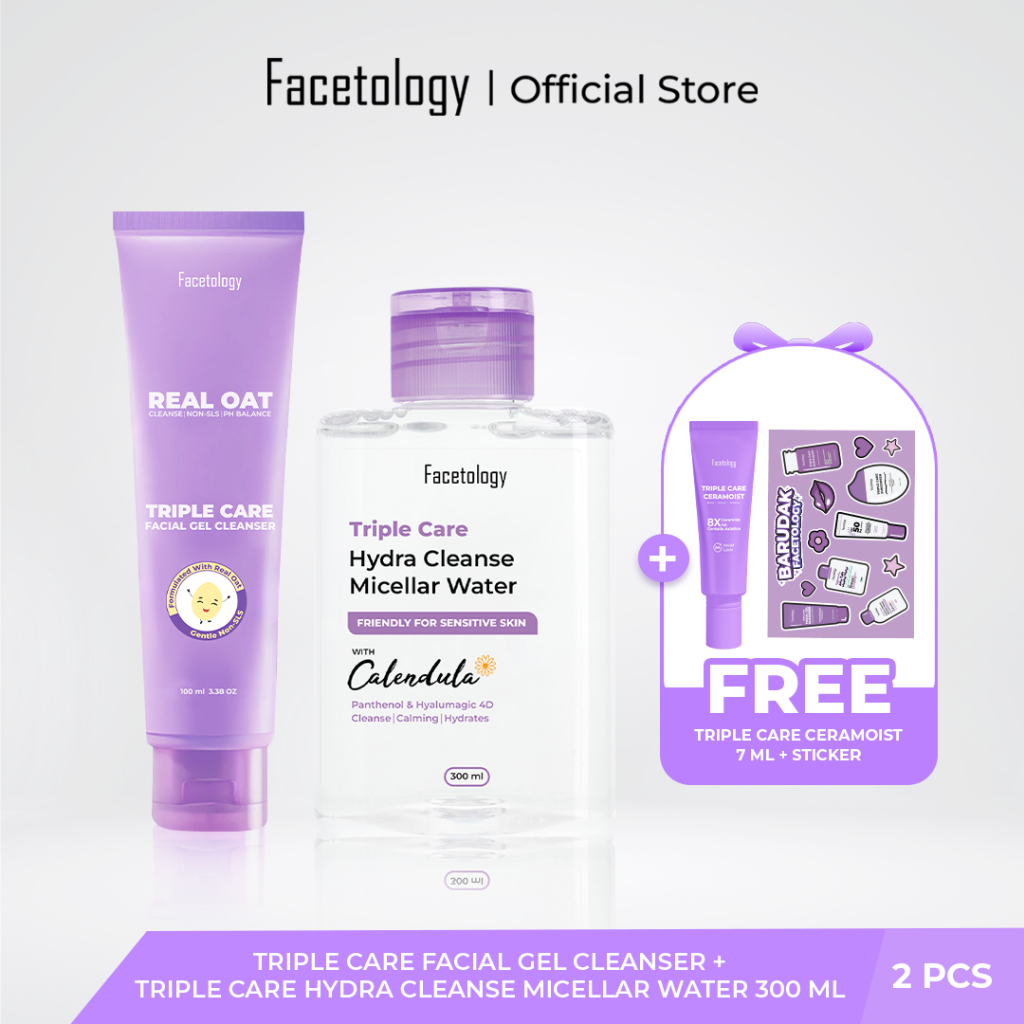 FACETOLOGY BUNDLING TRIPLE CARE FACIAL GEL CLEANSER HYDRA CLEANSE MICELLAR WATER 300 ML GET MOIST MINI SIZE & STIKER