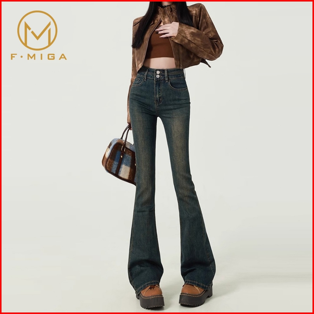 F Miga C106 High Waist Cutbray Flare Celana Jeans Panjang Wanita - Biru Retro