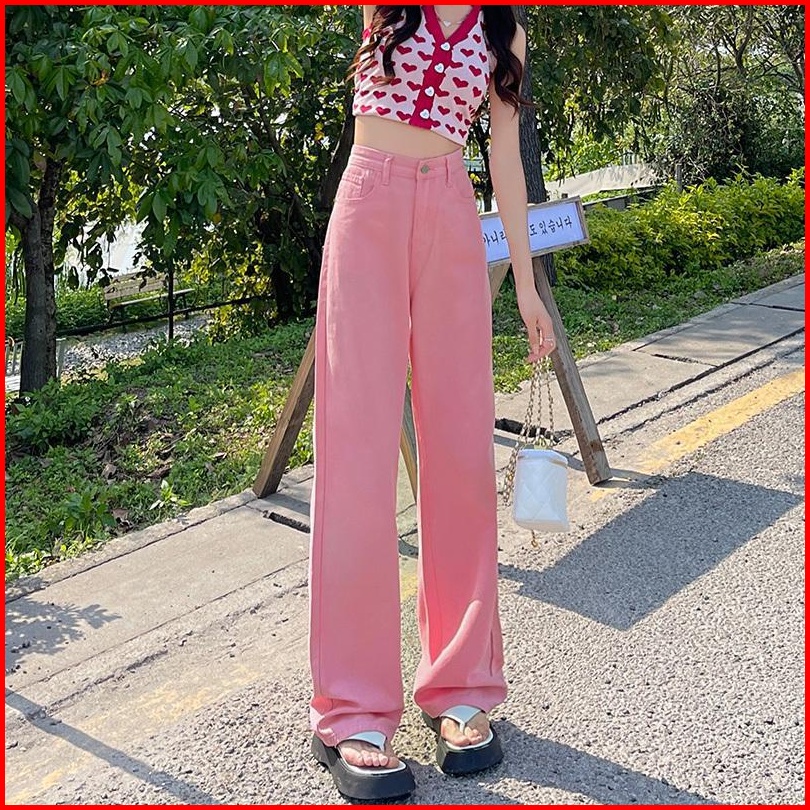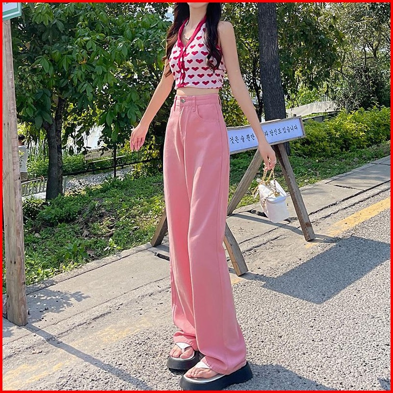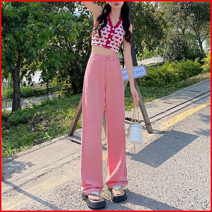 Celana Jeans Pink Wanita Celana Pinggang Tinggi Musim Panas Longgar Lurus