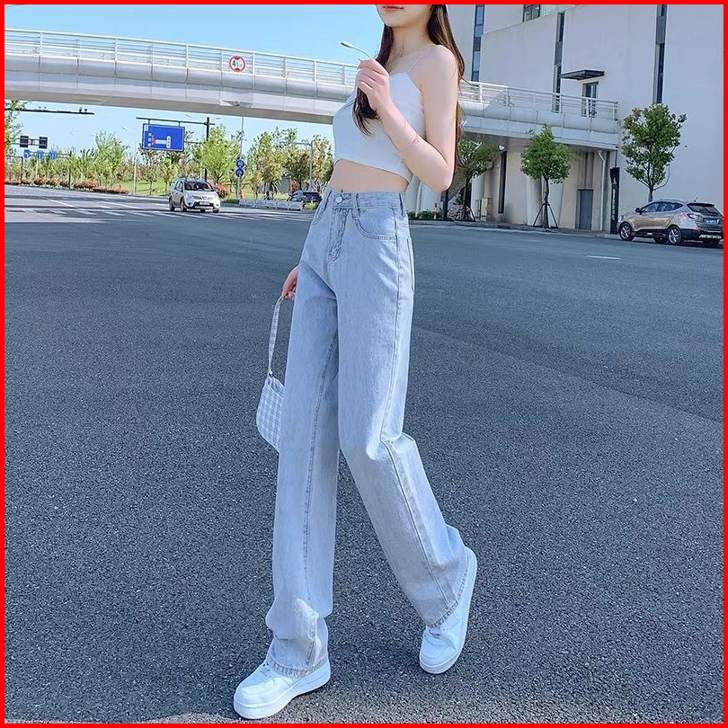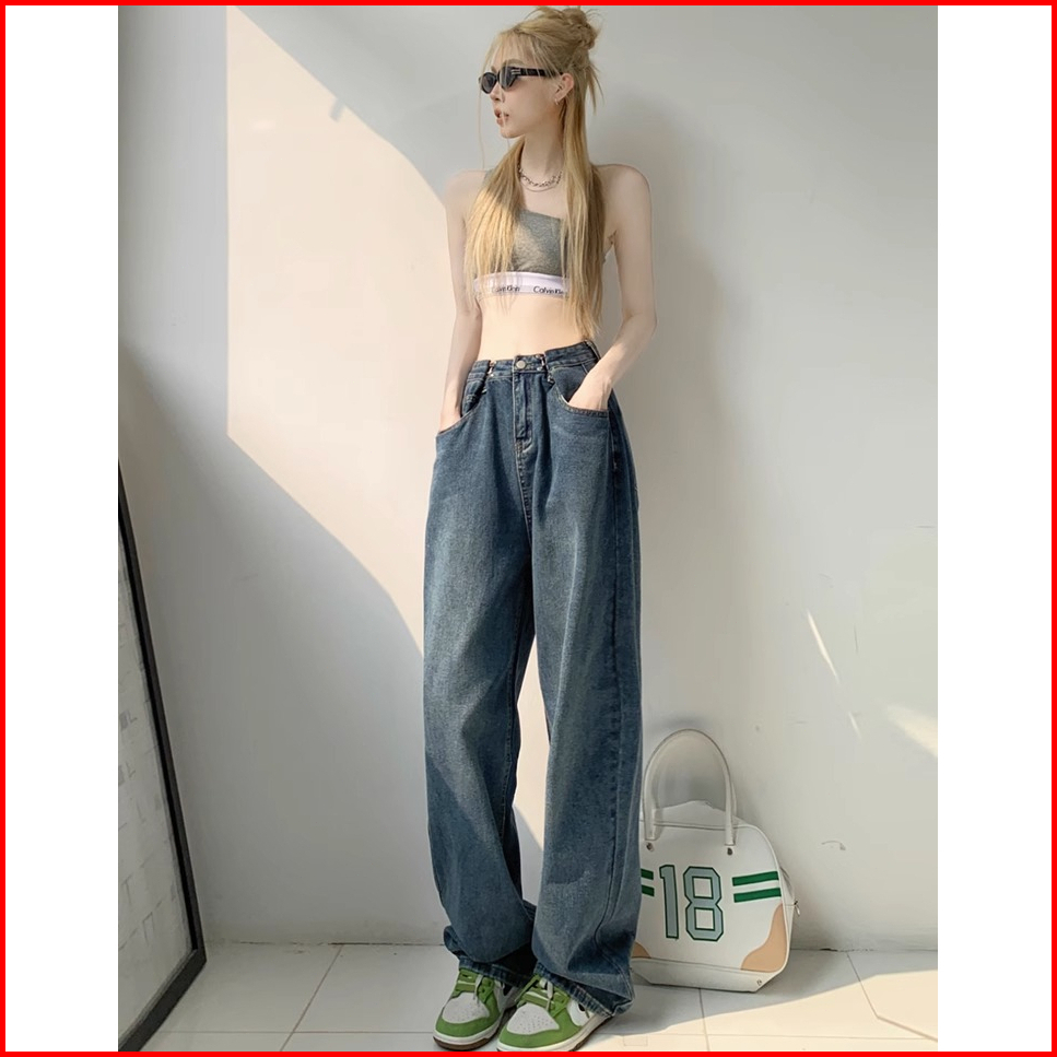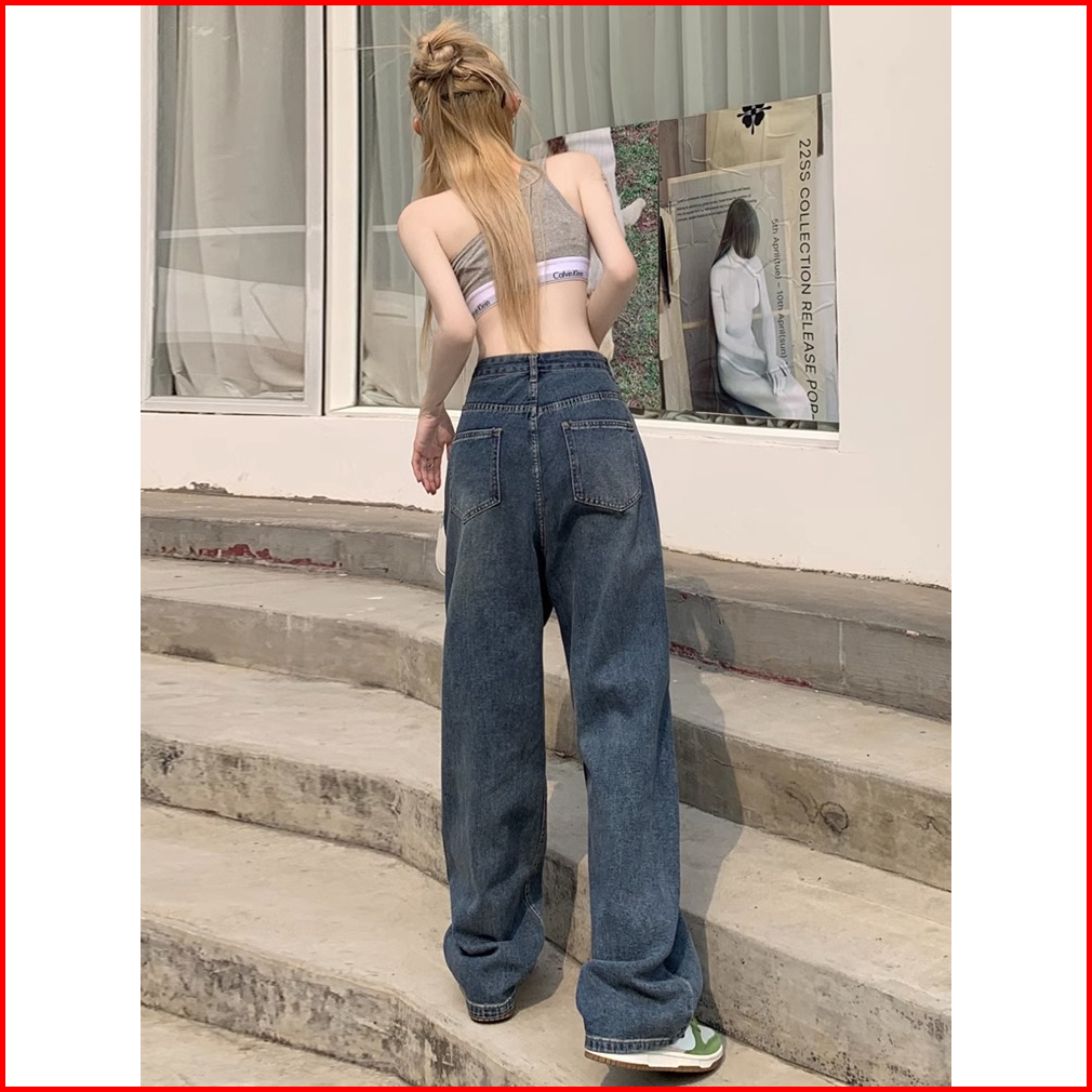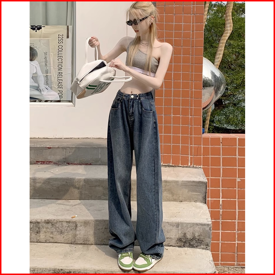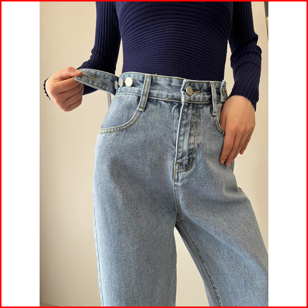 Celana Jeans Wanita High Waist Longgar Pinggang Celana Lebar Kaki Lurus