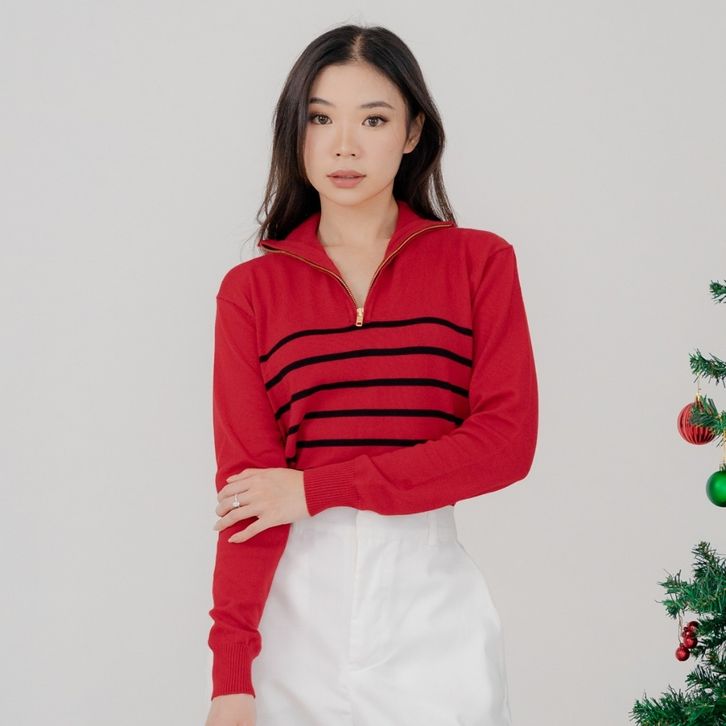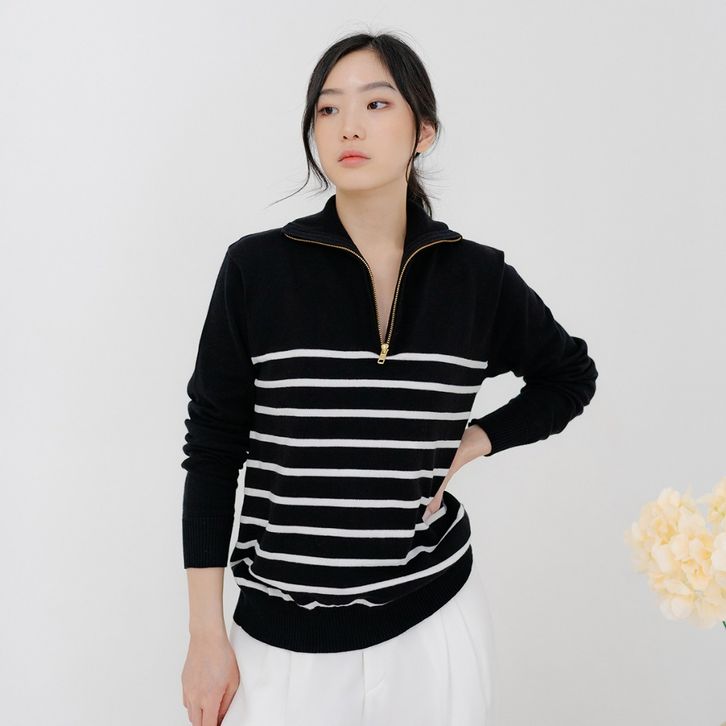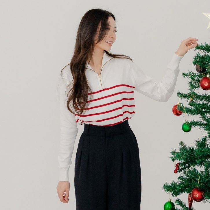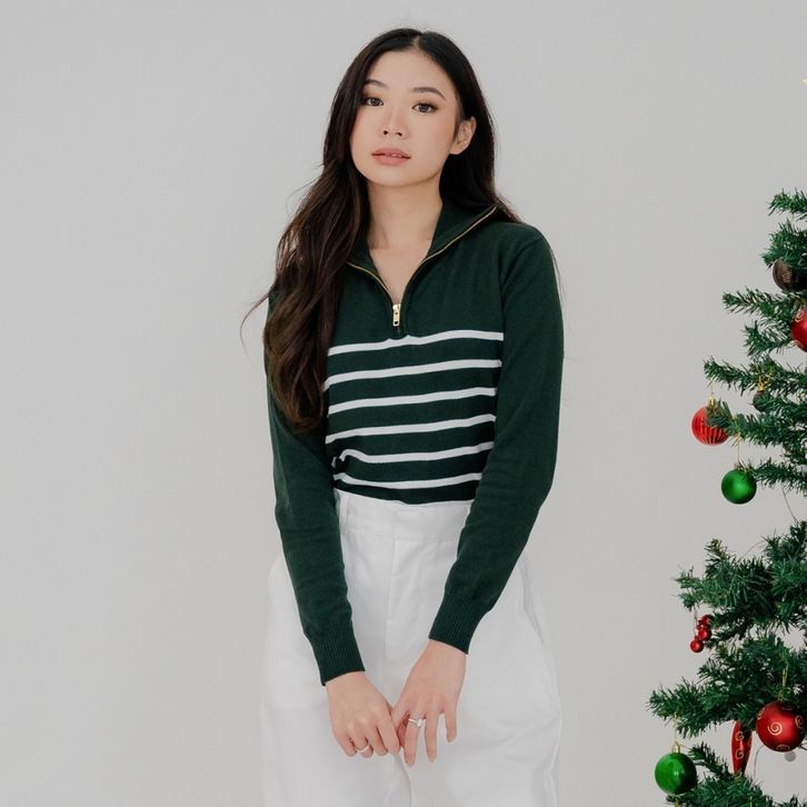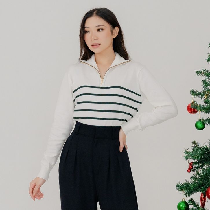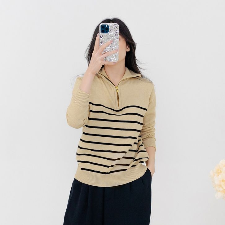 Sweater Zara Knit Striped Zipper Premium Motif Garis Salur