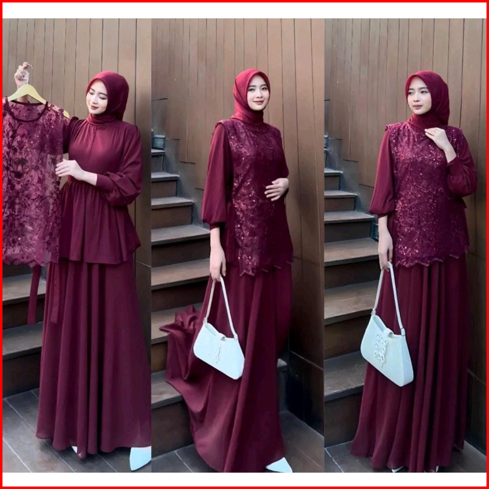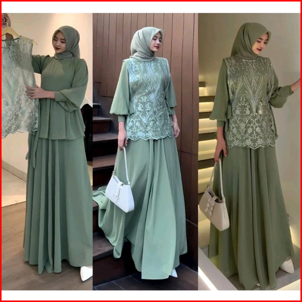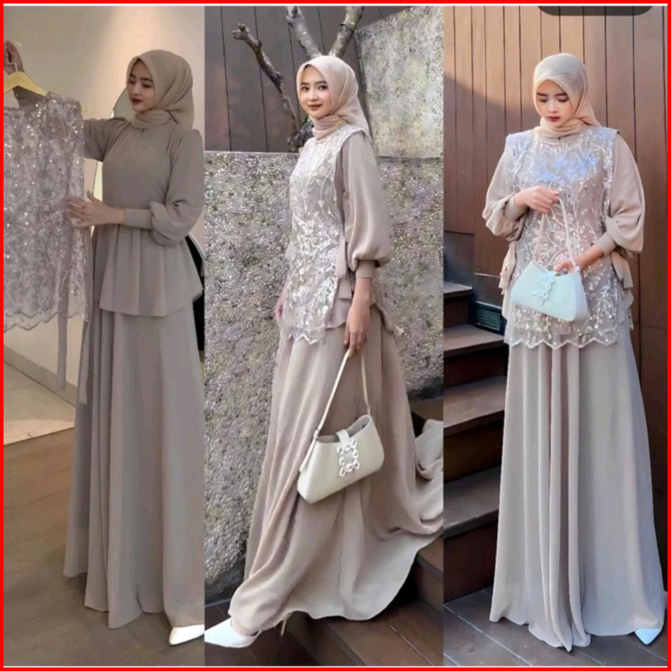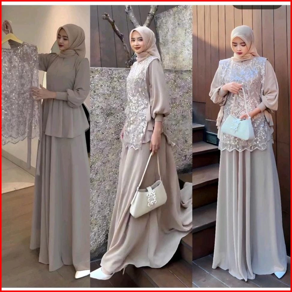 Vallina Outfit - Cintya Maxy Dress Set Vest Brokat Premium Gamis Wanita Muslim Pesta Kondangan Modern M - Xl