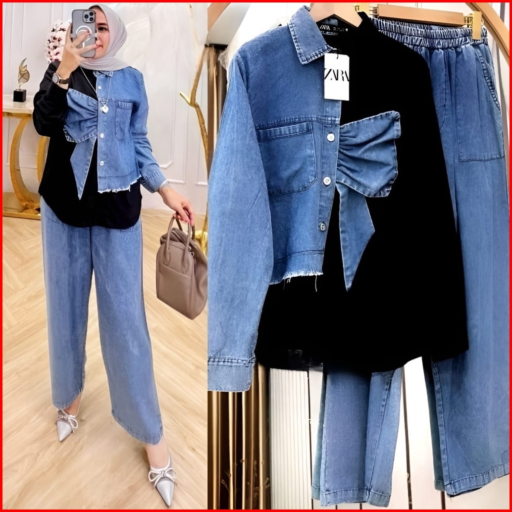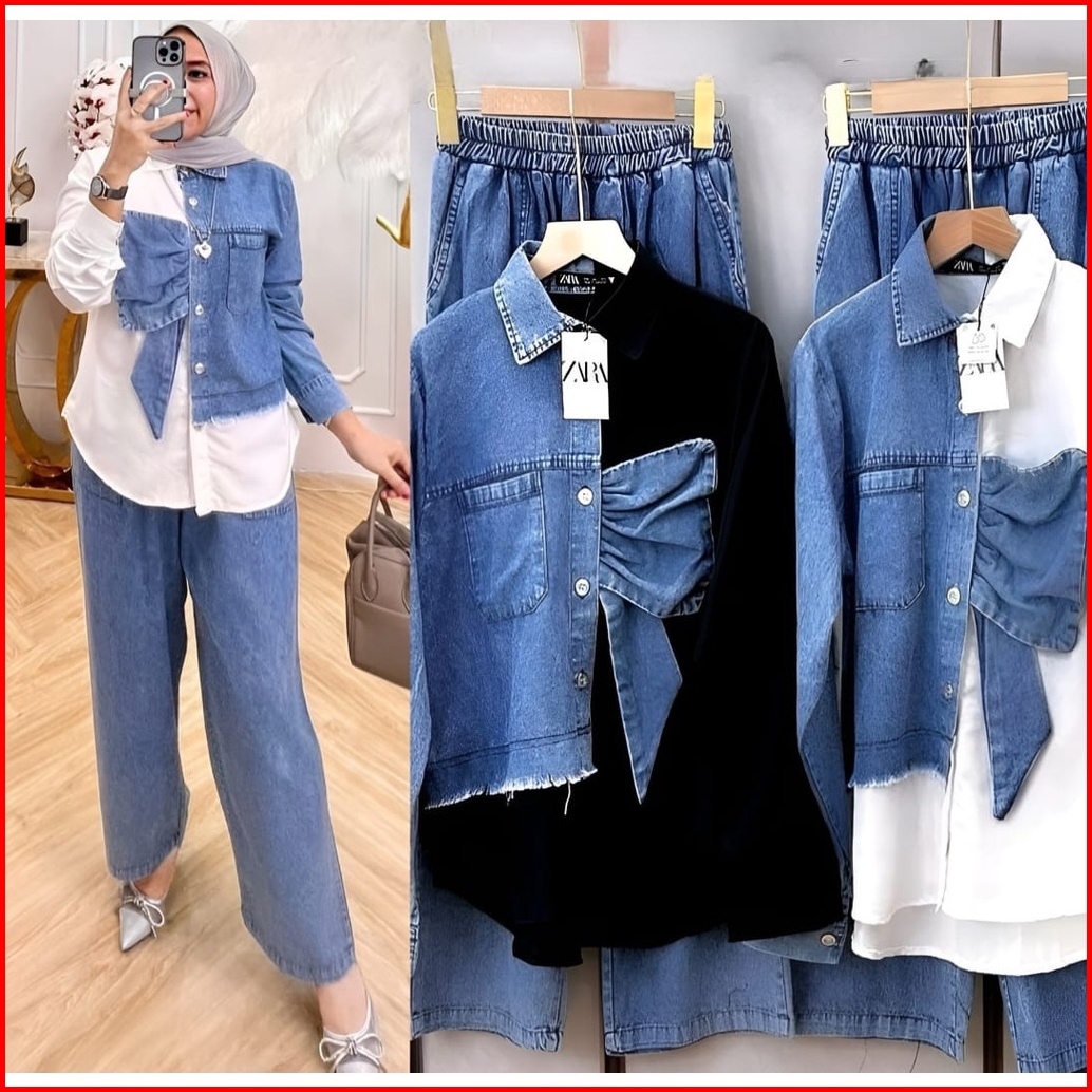 Vallina Outfit - Narnia One Set Pita Shirt Jeans Mix Toyobo Setelan Celana Wanita Muslim Modern Kekinian Premium
