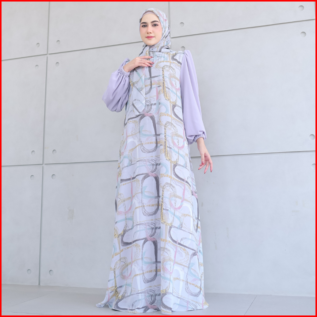 Aisyalina Id Naisha Set Series 29 Pashmina Segiempat Bahan Ceruti Motif Printing Full Furing Gamis Wanita Elegan Tangan
