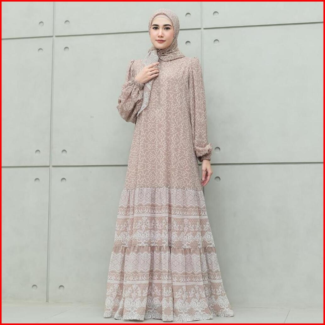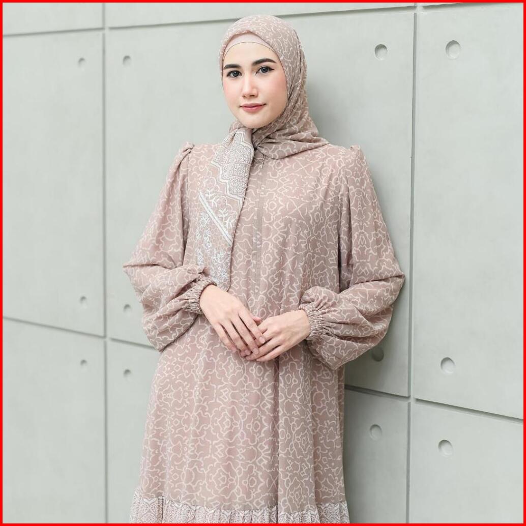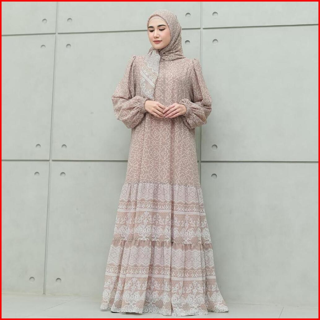 Aisyalina Id Sabella Set Series 62 Series 63 Pashmina Segiempat Bahan Ceruti Motif Printing Dress Gamis Wanita Motif Tan