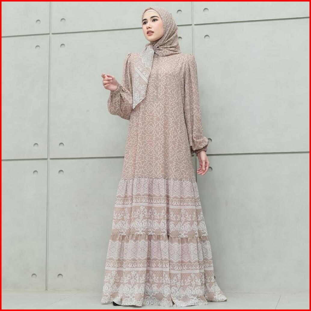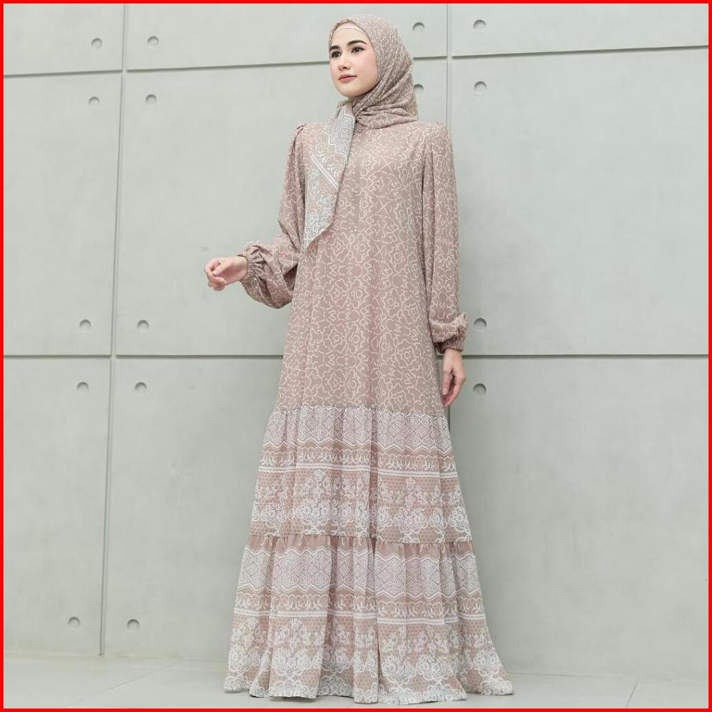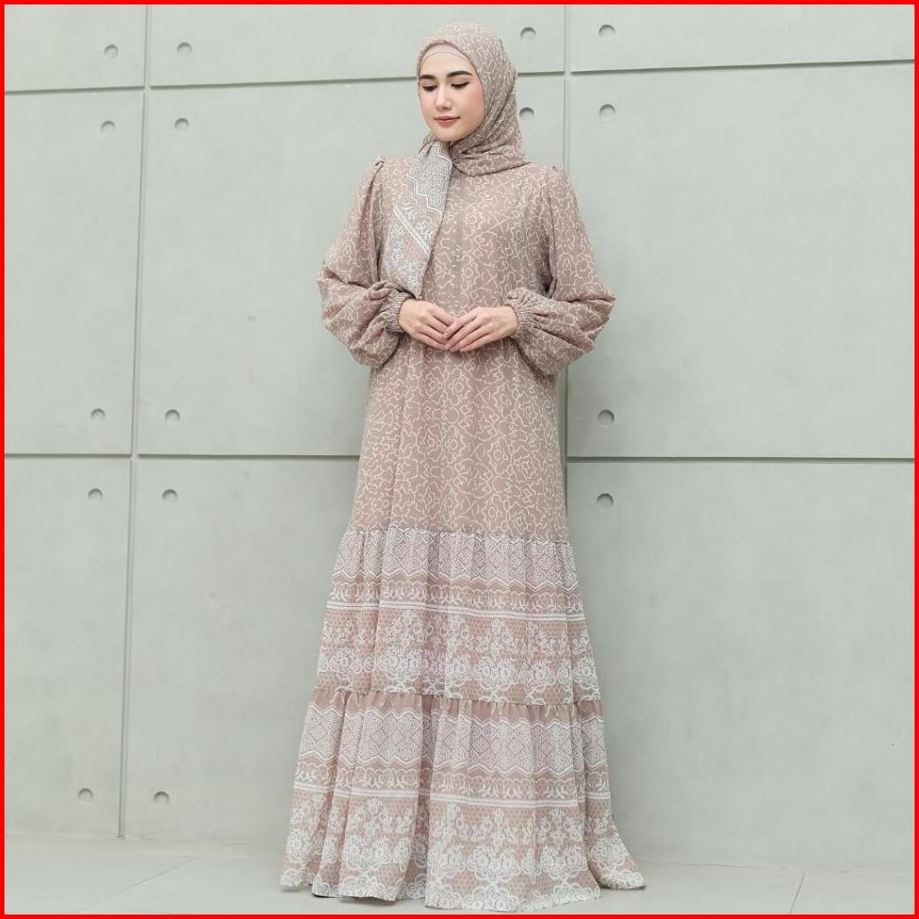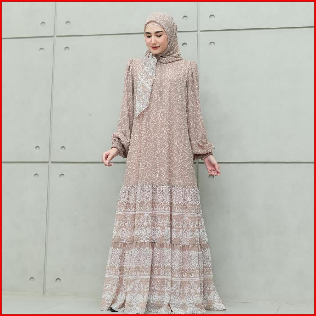 Aisyalina Id Sabella Set Series 62 Series 63 Pashmina Segiempat Bahan Ceruti Motif Printing Dress Gamis Wanita Motif Tan
