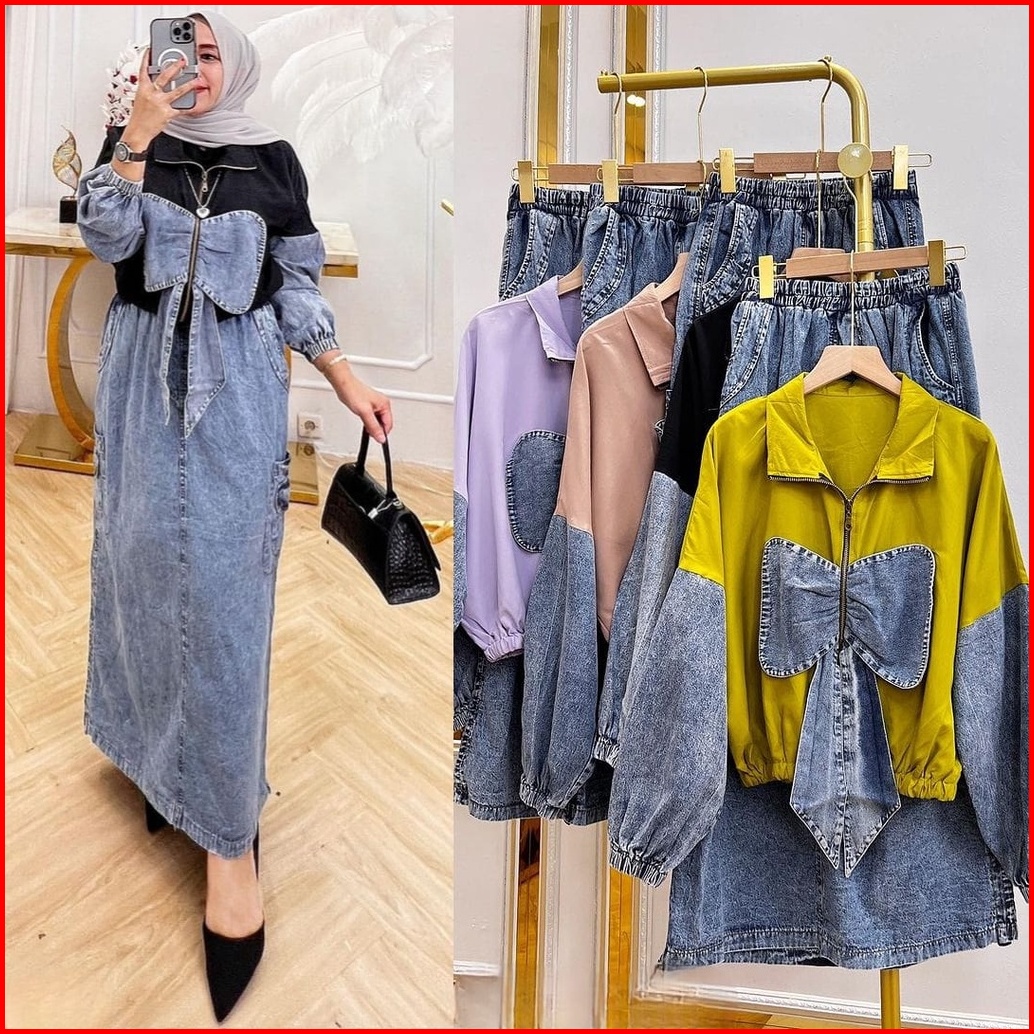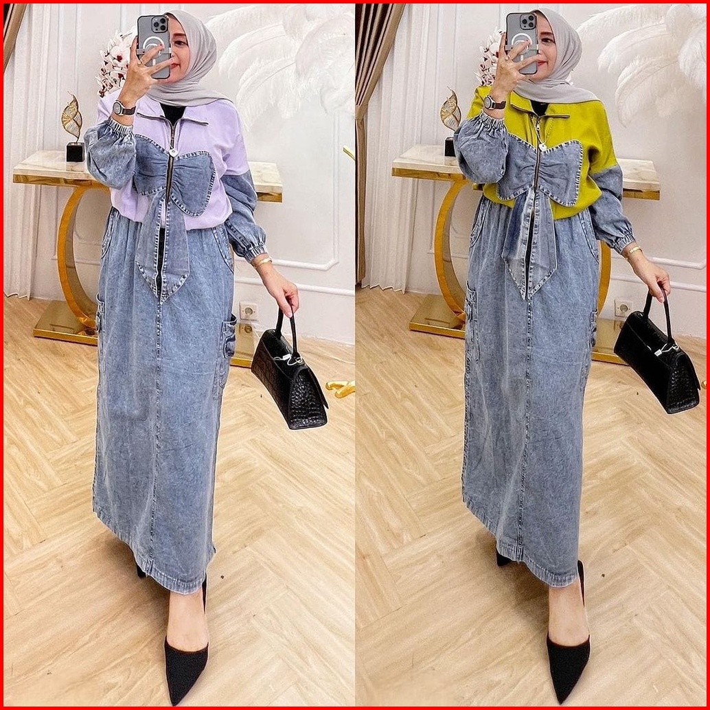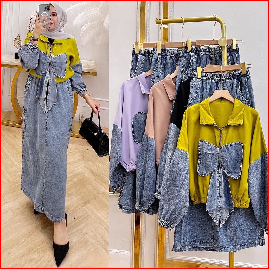 R.a - Sherina Set Rok Wanita Muslim Modern Kekinian Matt Toyobo Mix Jeans Setelan Busui Friendly Ootd Lebaran Fashion Te