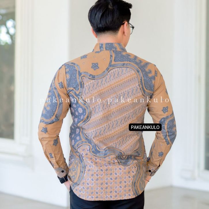 Batik Formal Kondangan Pria PAKEANKULO Batik Premium Pria Slimfit Motif Ismanto Kunyit Denim Lengan Panjang TERLARIS