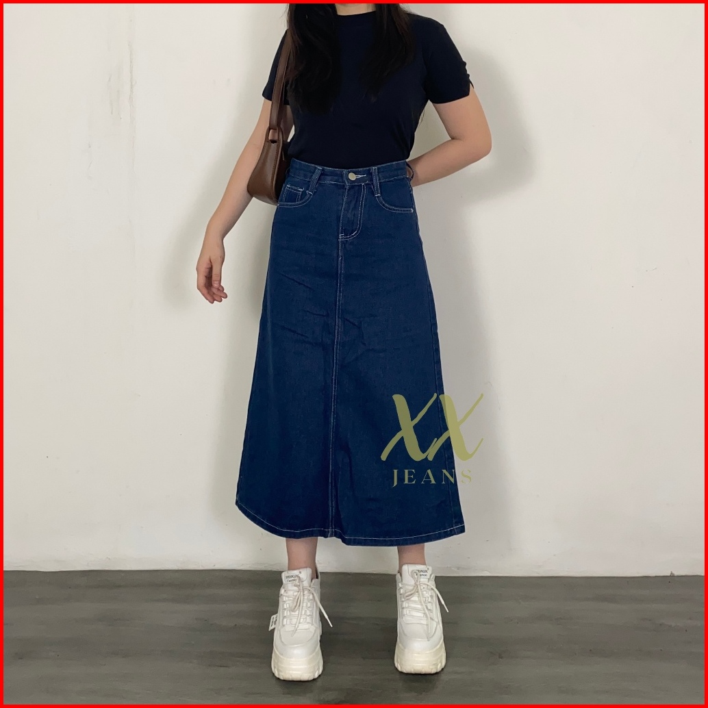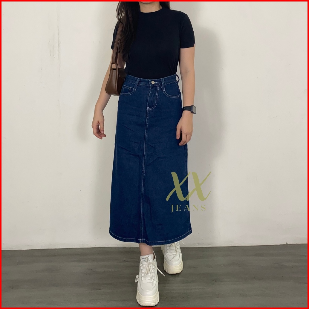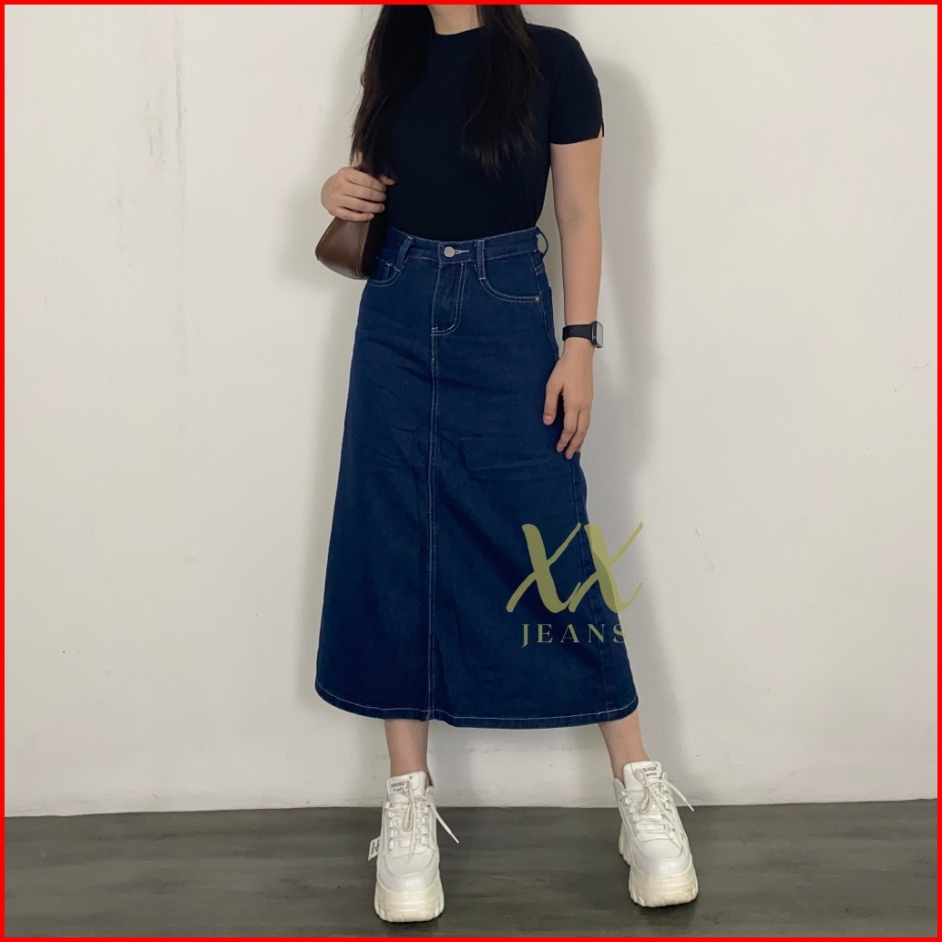 D10 - Rok Jeans Panjang High Waist Wanita Korean Style Skinny Import Premium Quality Polos Biru Tua