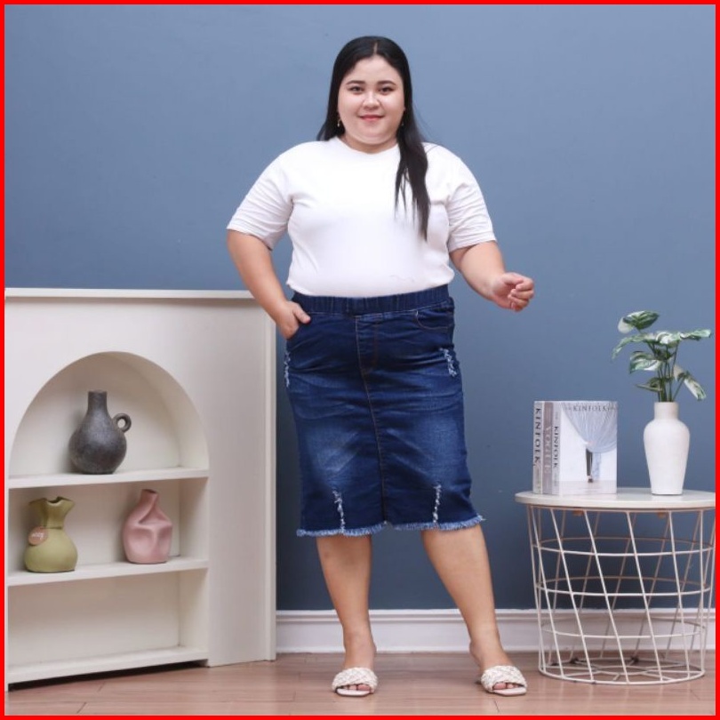 Rok Span Jeans Wanita Kekinian Pinggang Karet Ukuran Jumbo