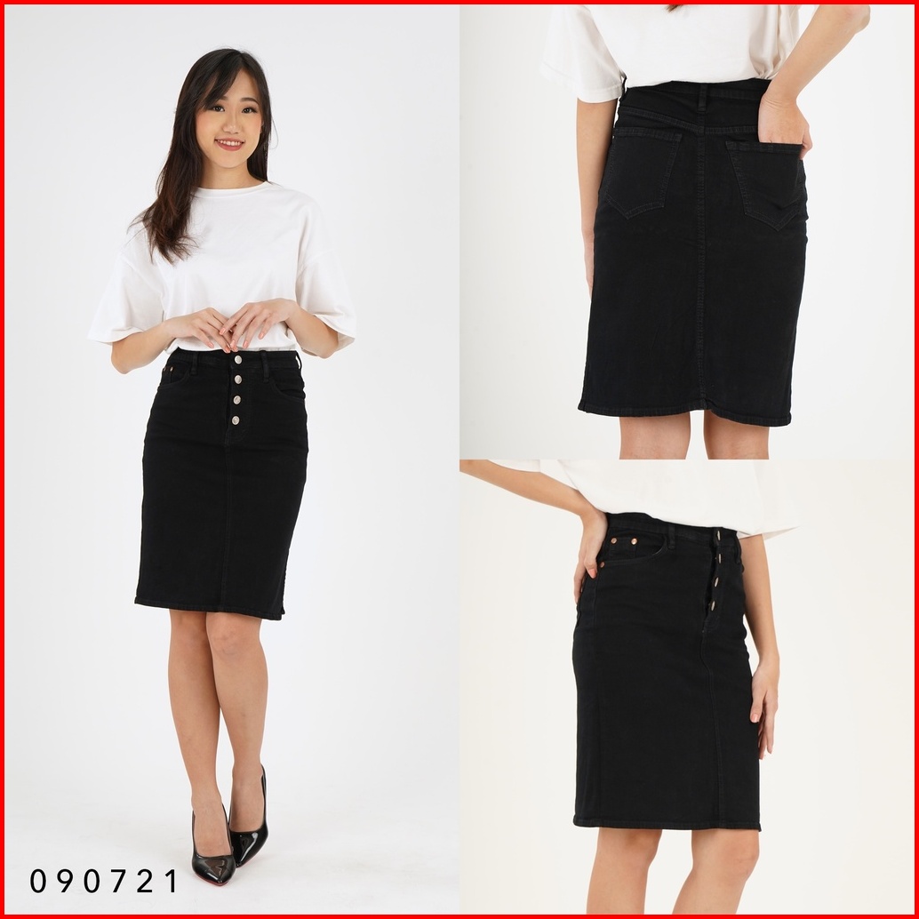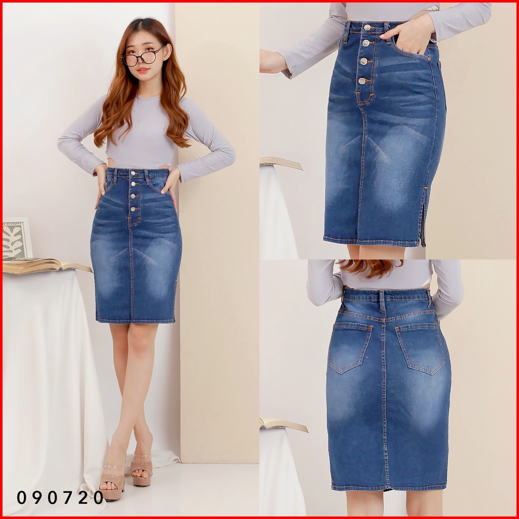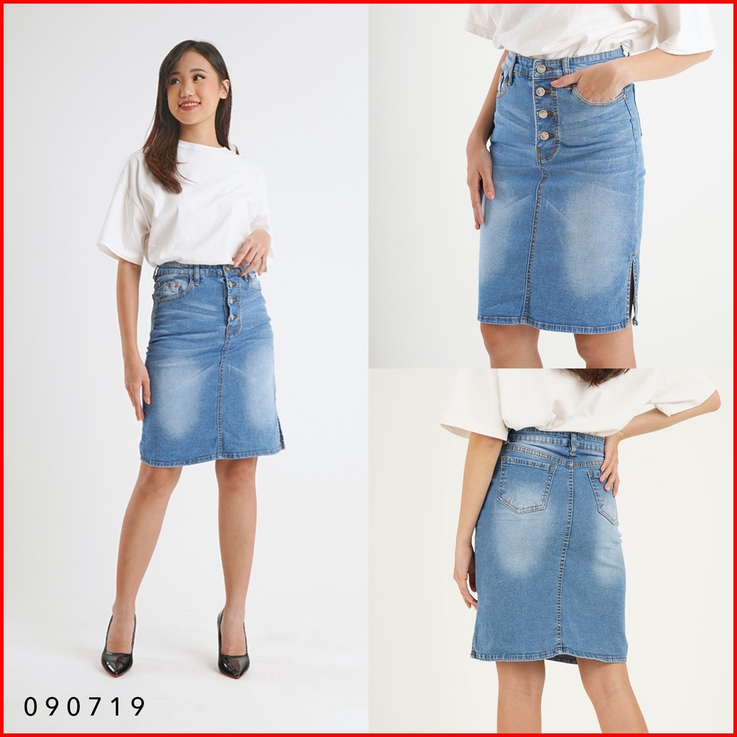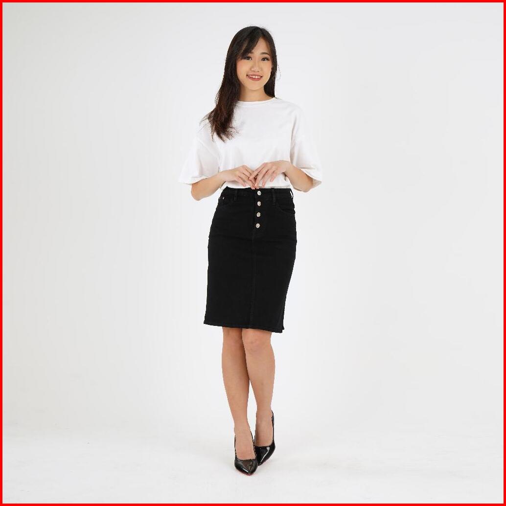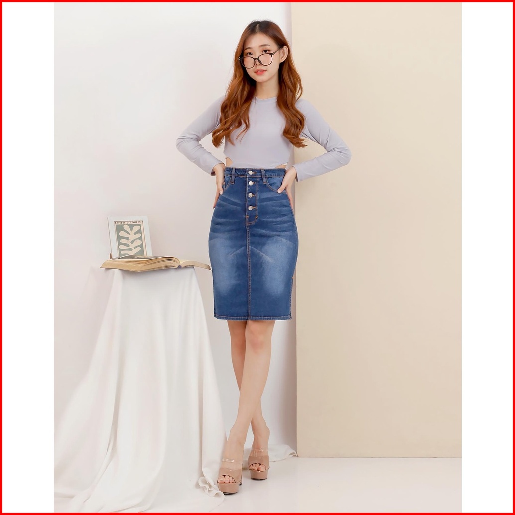 Rok Jeans Span Pendek Mini Skirt Denim Wanita Kancing 4 Stretch Trendy