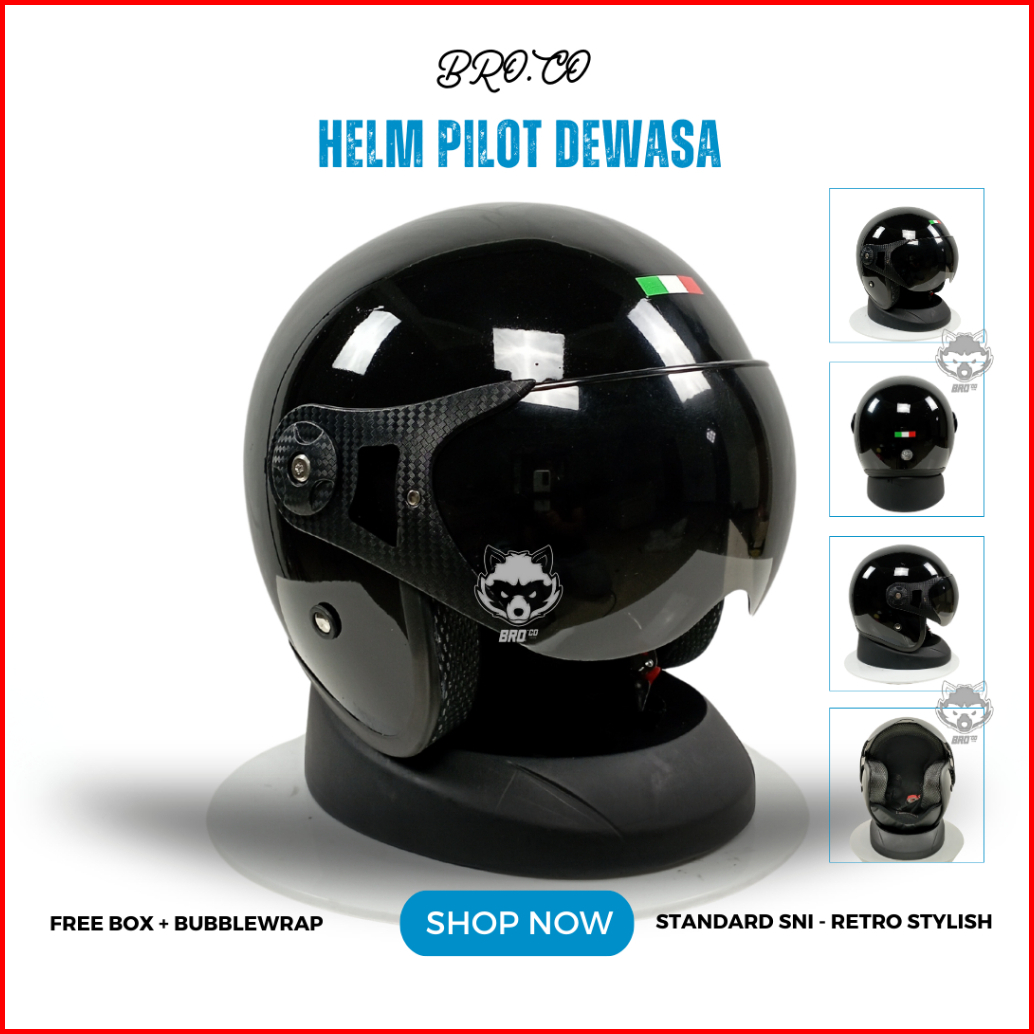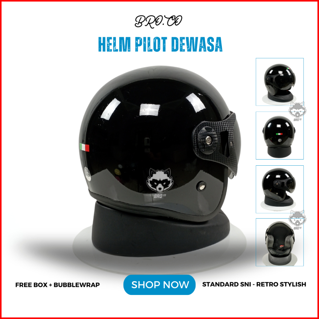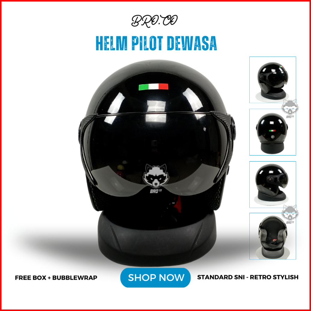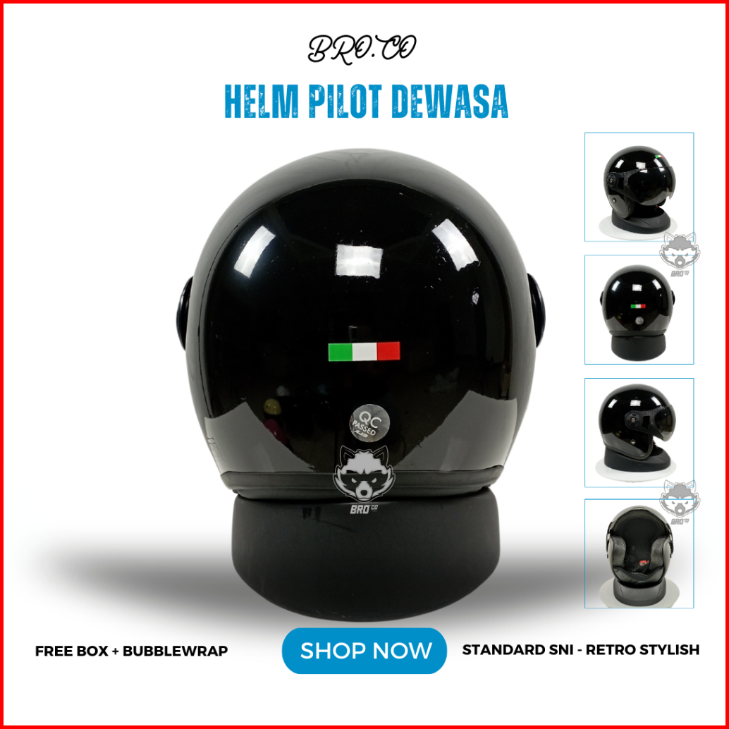 Helm Pilot Retro Italy Dewasa Half Face Hitam Black Glossy Standard Sni Premium Bro.co Untuk Laki-laki Dan Perempuan Cow