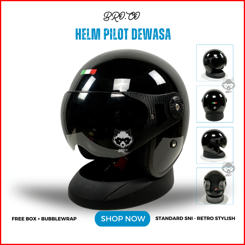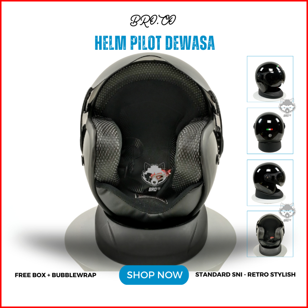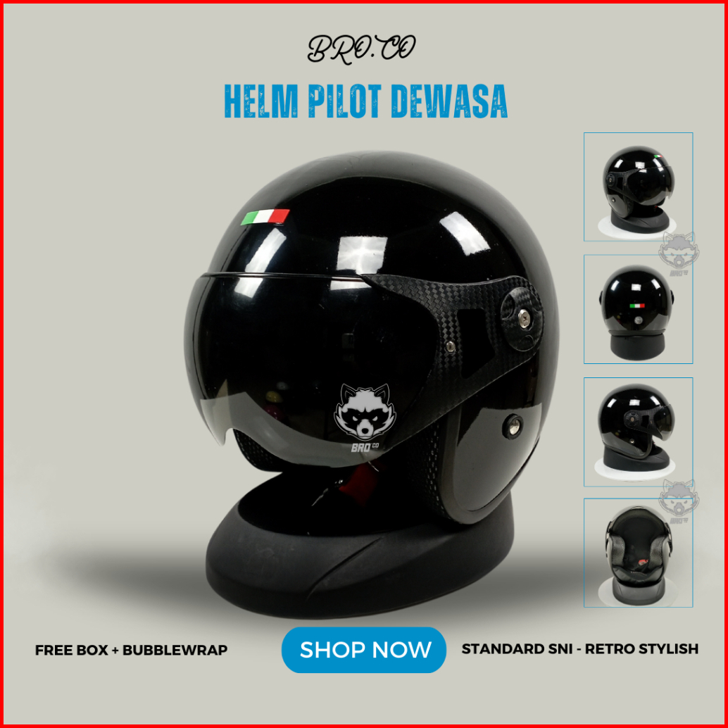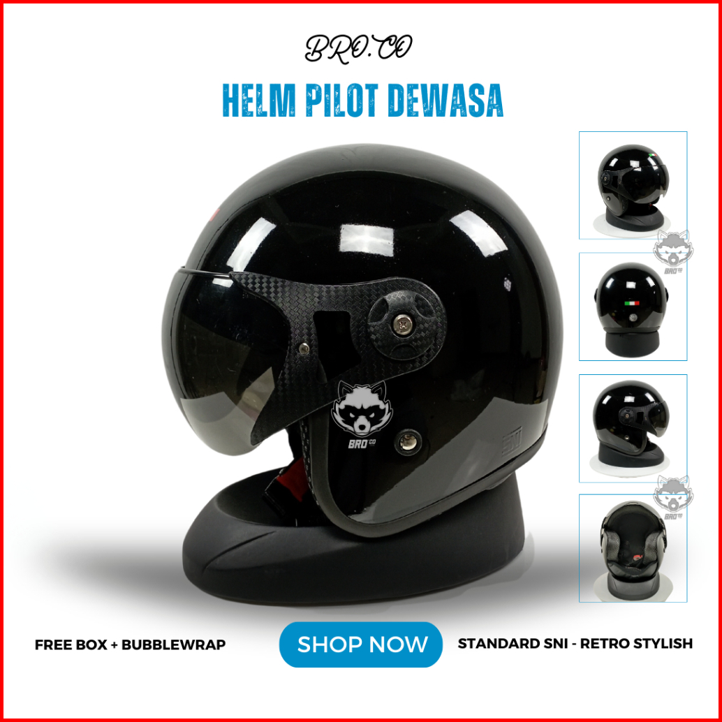 Helm Pilot Retro Italy Dewasa Half Face Hitam Black Glossy Standard Sni Premium Bro.co Untuk Laki-laki Dan Perempuan Cow