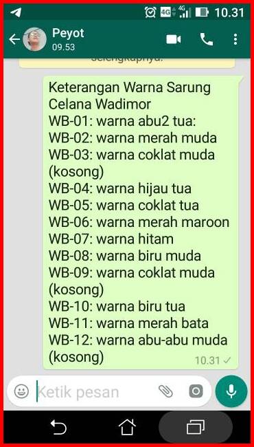 Hitam, Merah Bata, Biru Tua, Hijau Army, Coklat Tua, Hijau, Coklat Krem, Coklat Muda, Biru Muda, Merah Nyala, Abu Tua, Merah Maroon, Abu-abu, Lux Abu Tua, Kuning, Abu Kotak, Coklat Luxury, Salur Hijau, Salur Abu-abu, Salur Hitam, Salur Ungu Tua, Hitam polos, Hijau Army TK, Merah Bata TK, Hijau TK, Merah TK, ABU TUA TK, Maroon TK, Coklat Tua TK, Coklat Muda TK, Hitam TK, WadimorHitam02, Abata-tsaH-03, Abata-tsaB-03, Abata-tsa H-04, Abata-tsa B-04, Wadimo Full Motif 1, Wadimor Full Motif 2, Wadimor Full Motif 3