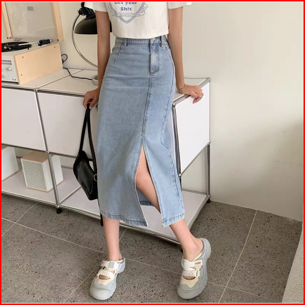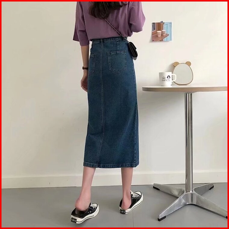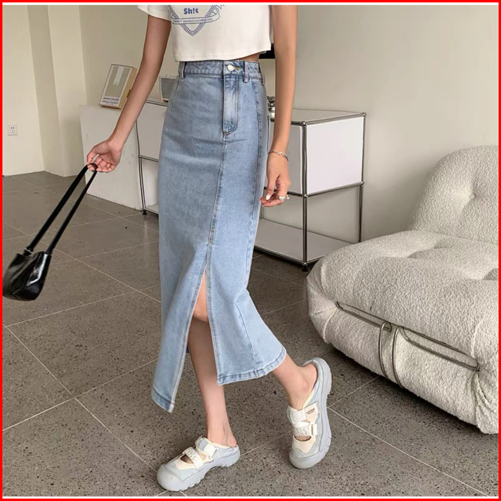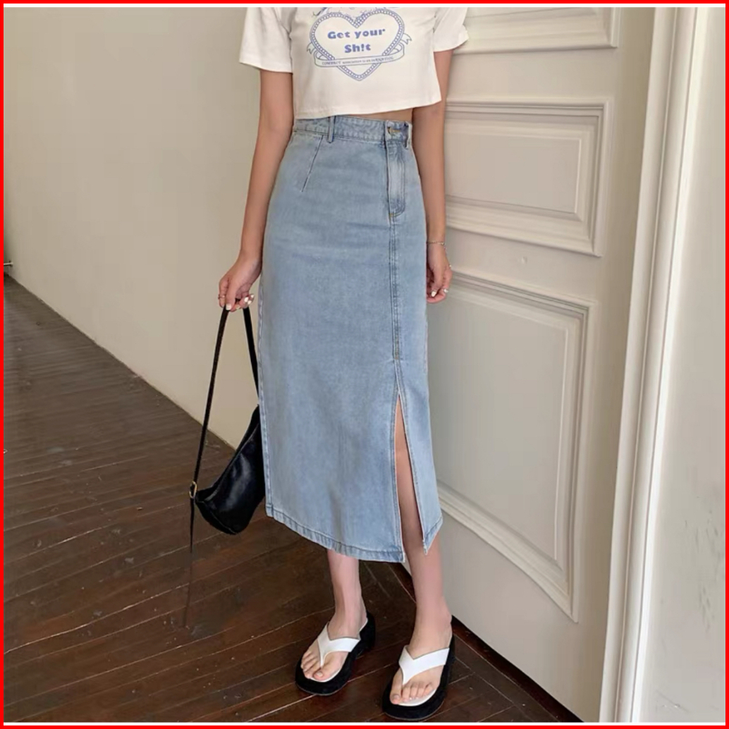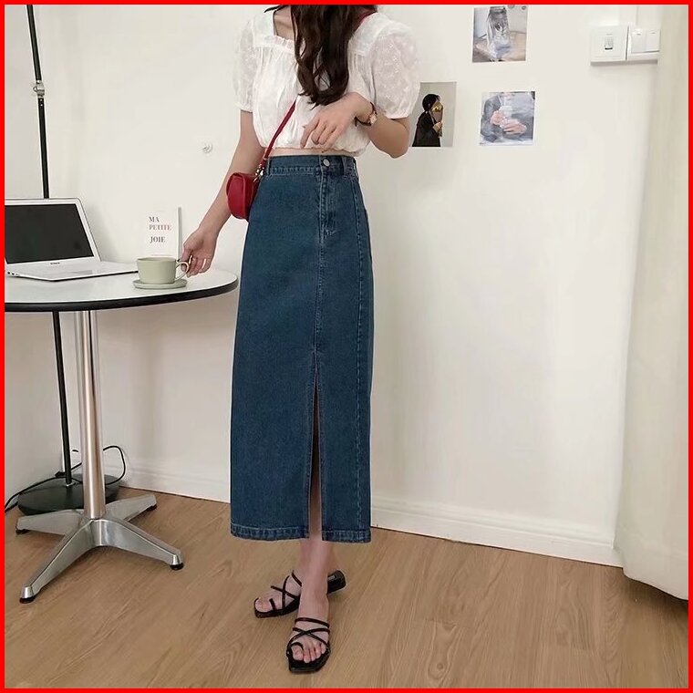 Lybh Store Rok Dres A-line Skirt Rok Panjang Denim A-line Skirt Korean Style Midi Slit Skirtrok Plisket Panjang Baju Keb