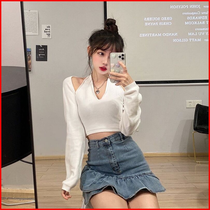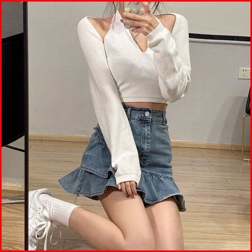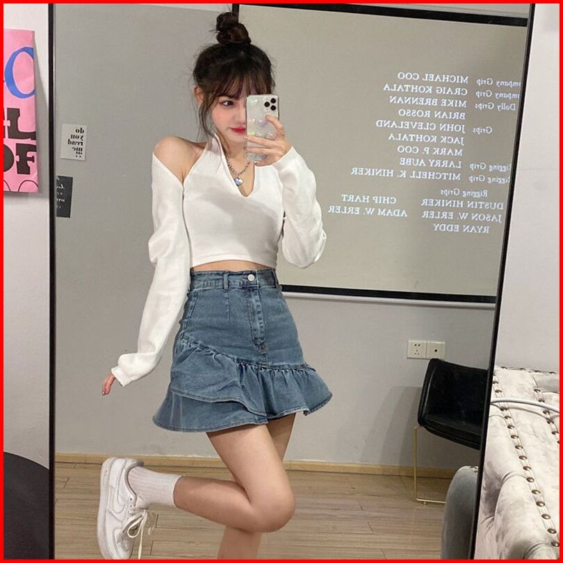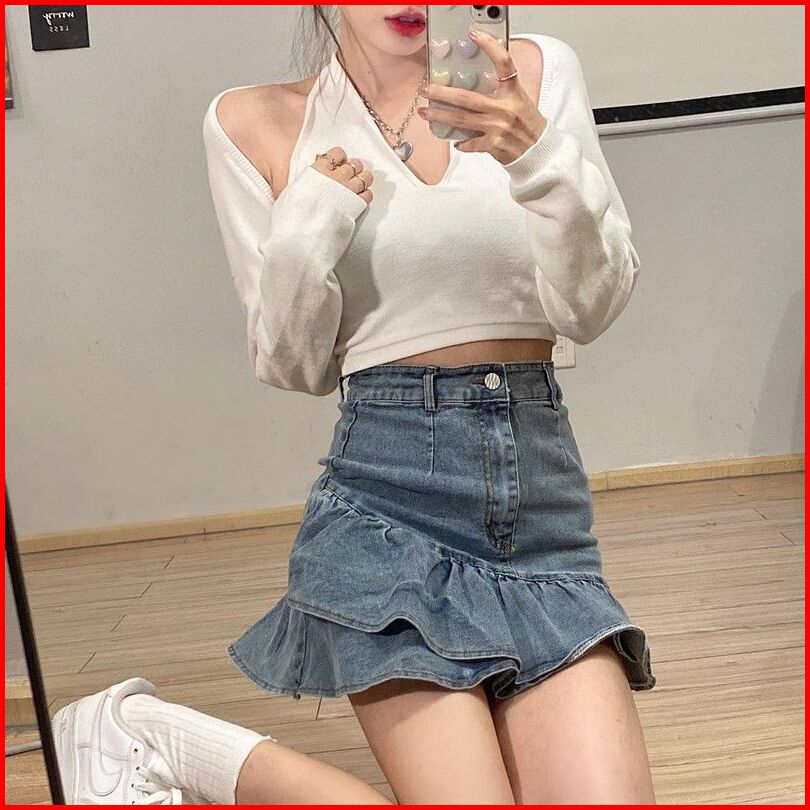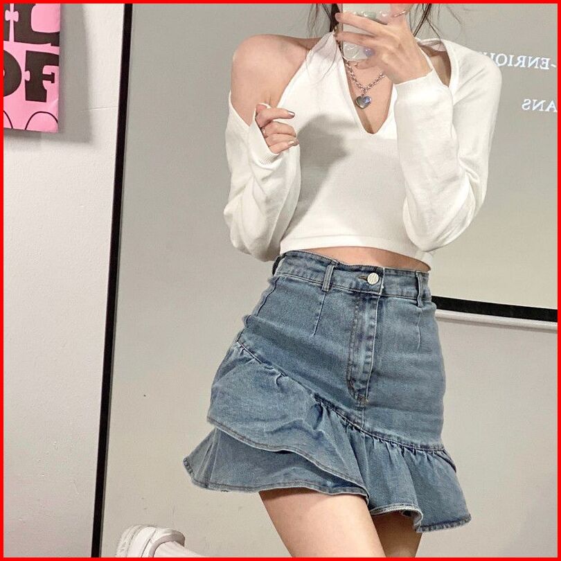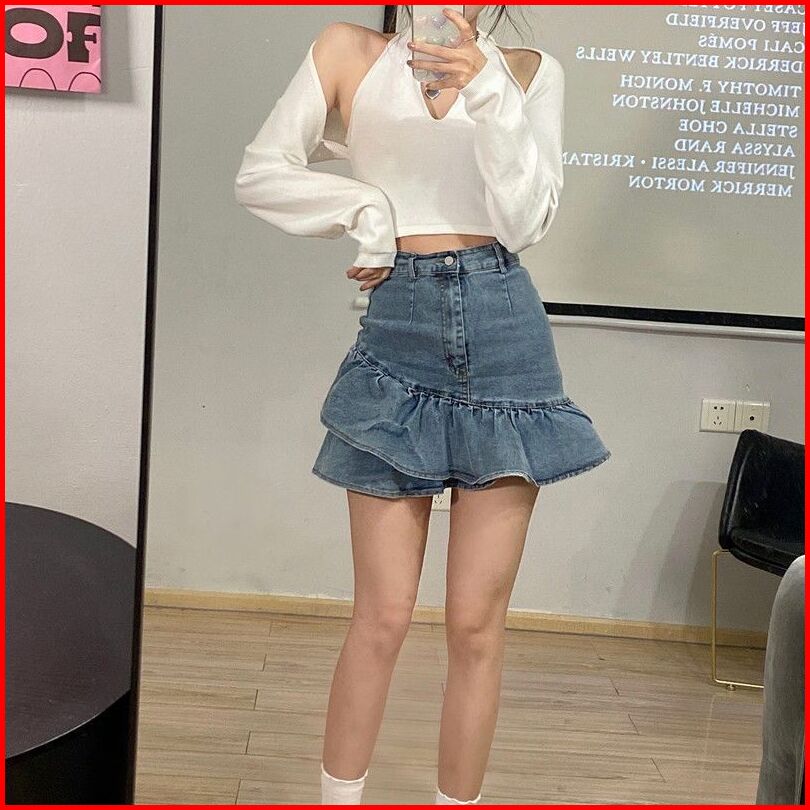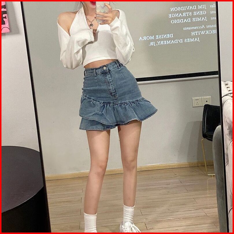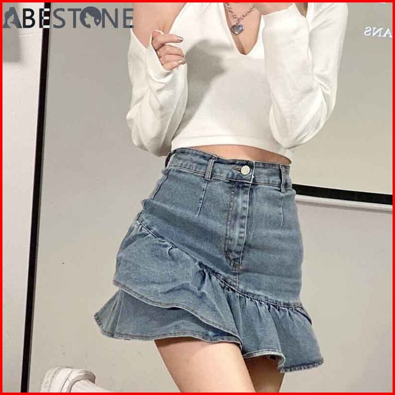 Rok Denim Pinggang Tinggi Retro Wanita Rok Denim Bentuk A