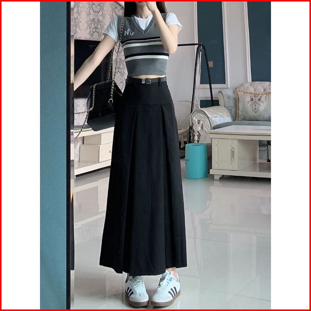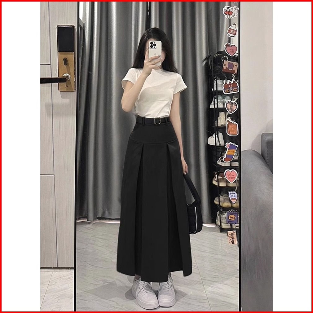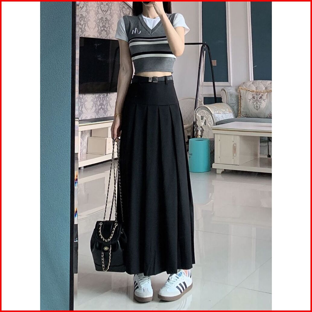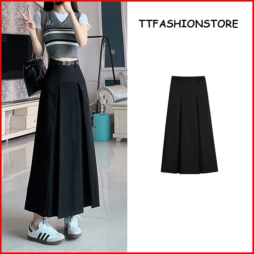 Rok Lipit A-line Hitam Wanita Kasual Impor Highwaist Korean Style
