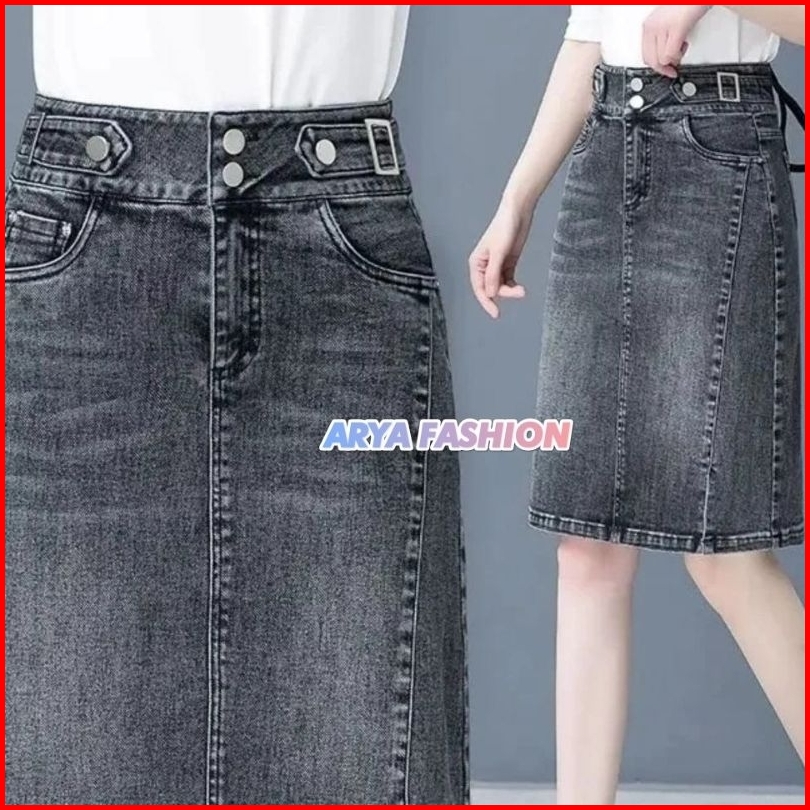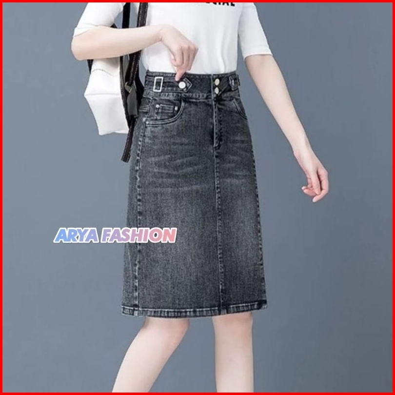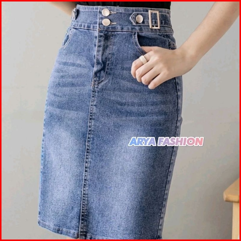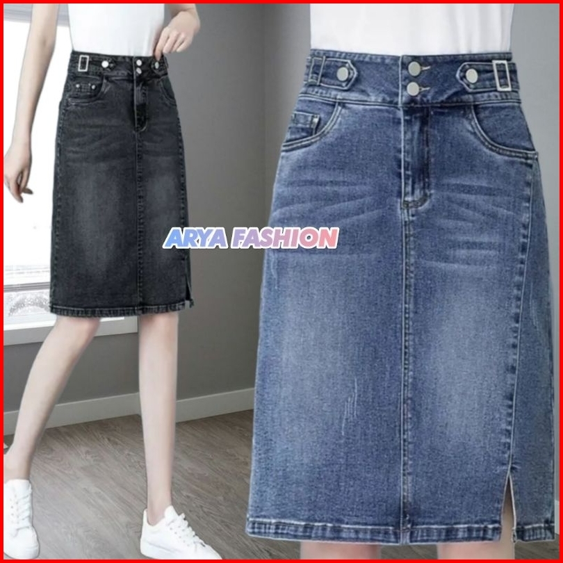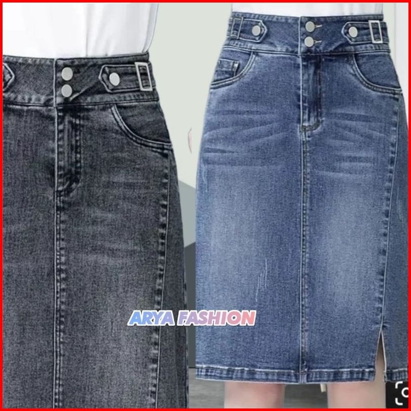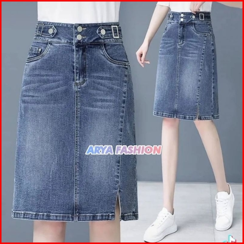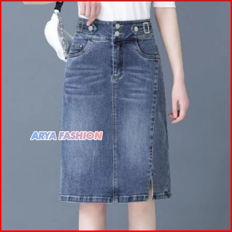 Rok Jeans Stretch Pendek Belah Samping Pinggang Karet M-l-xl