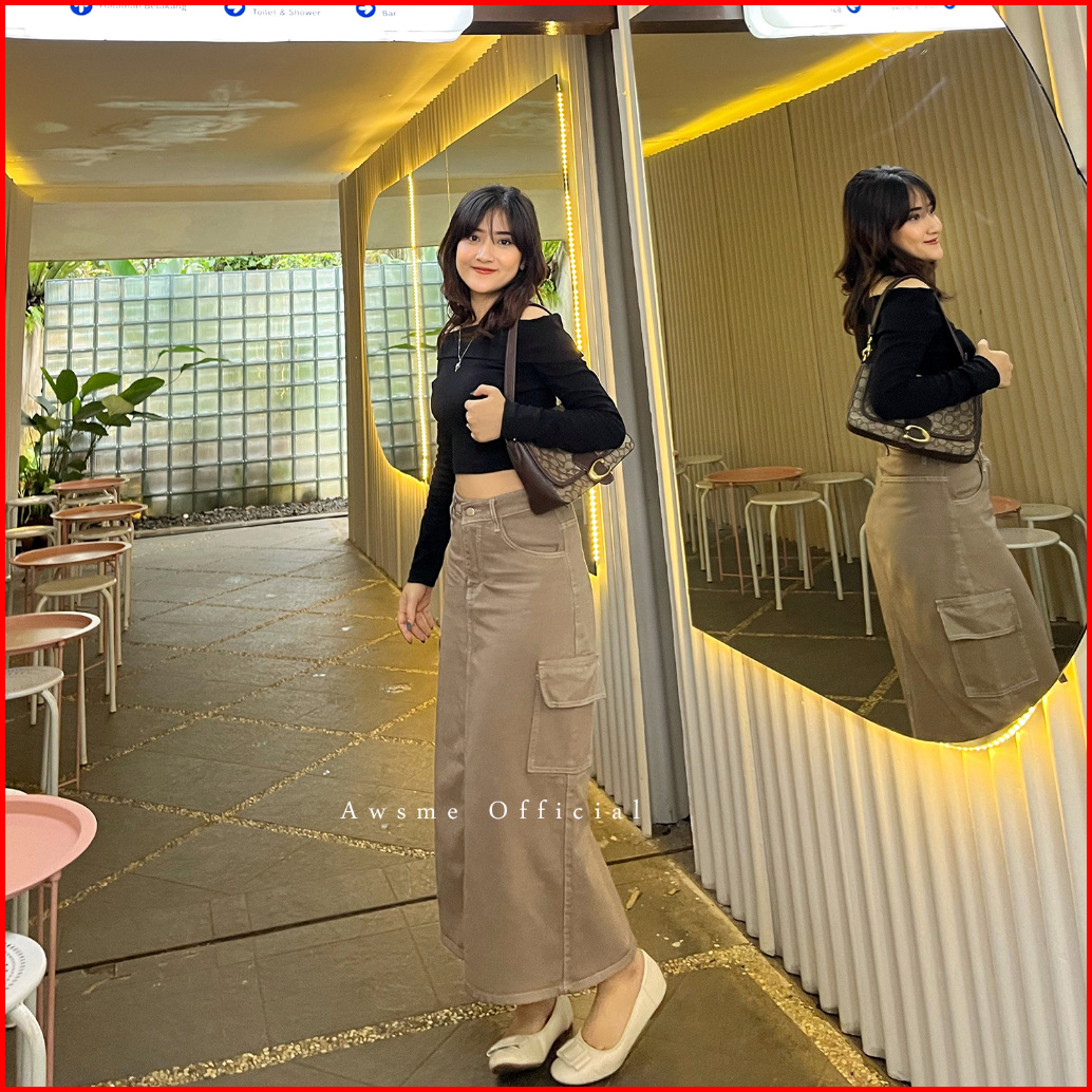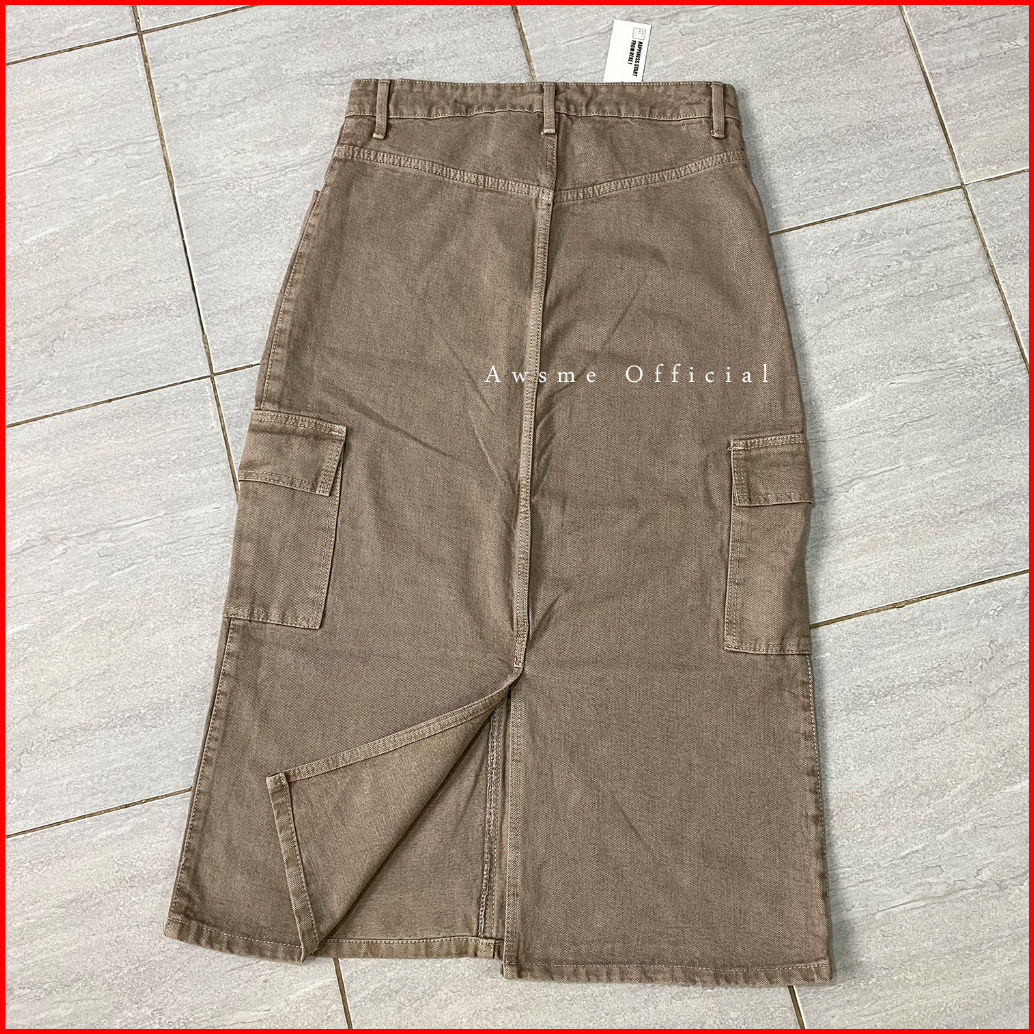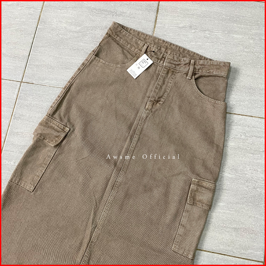 Awsme - Rok Cargo Jeans Mocca Celana Wanita Denim Highwaist Midi Skirt