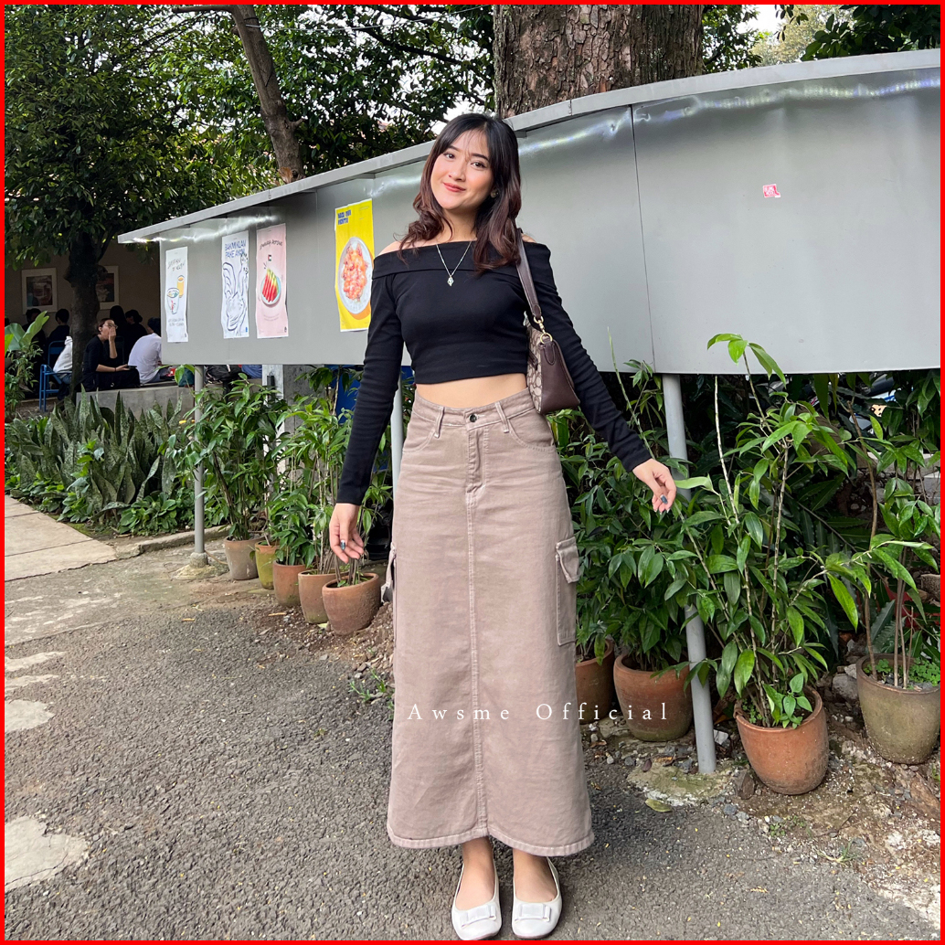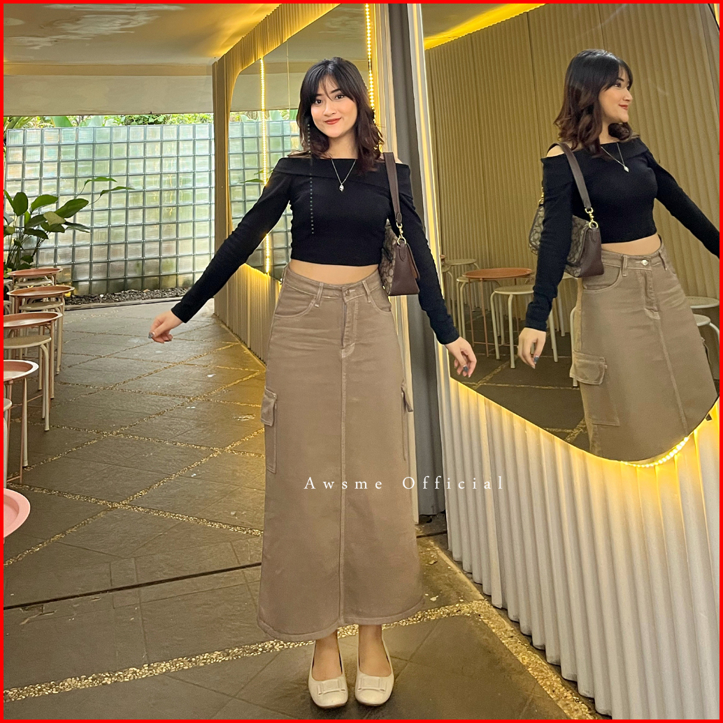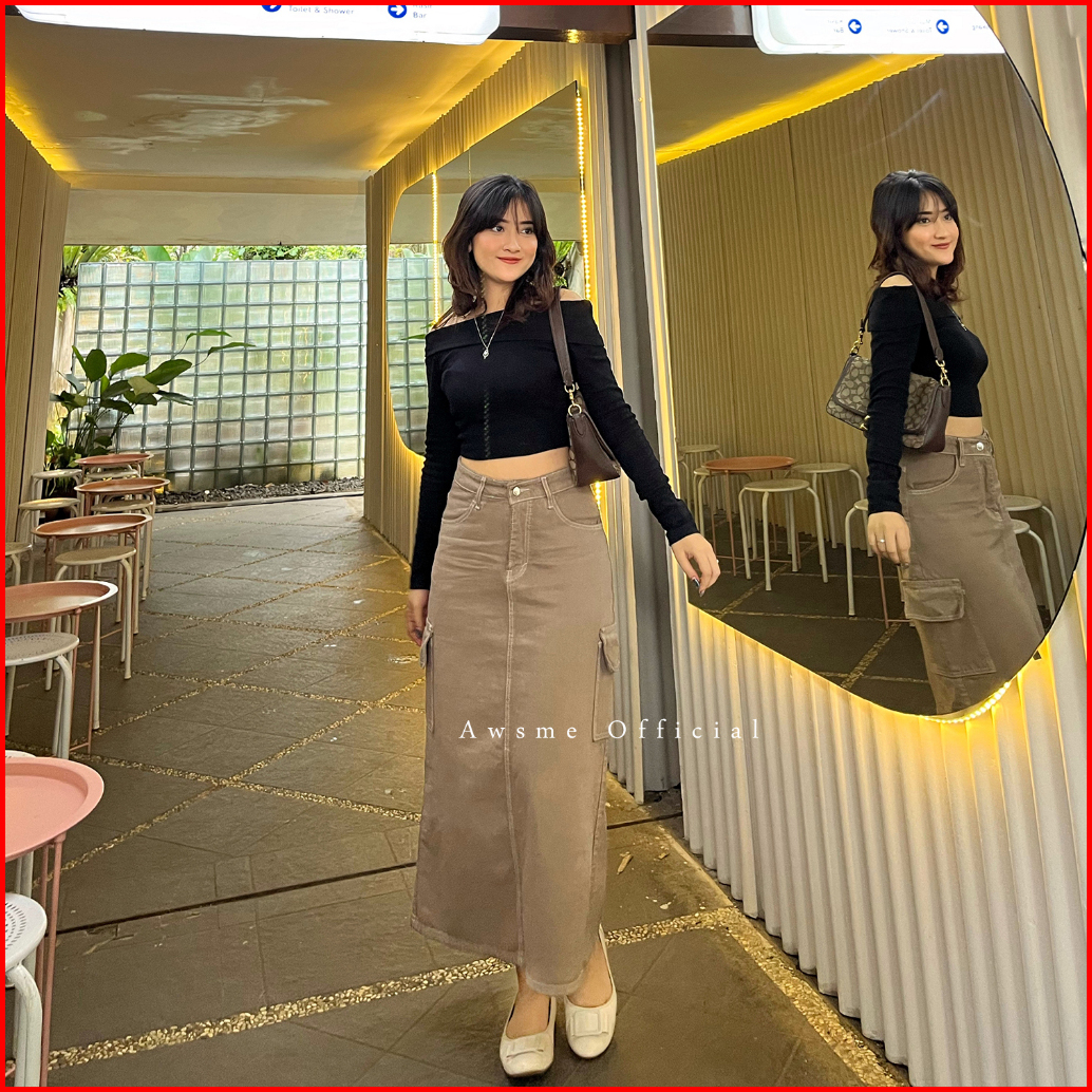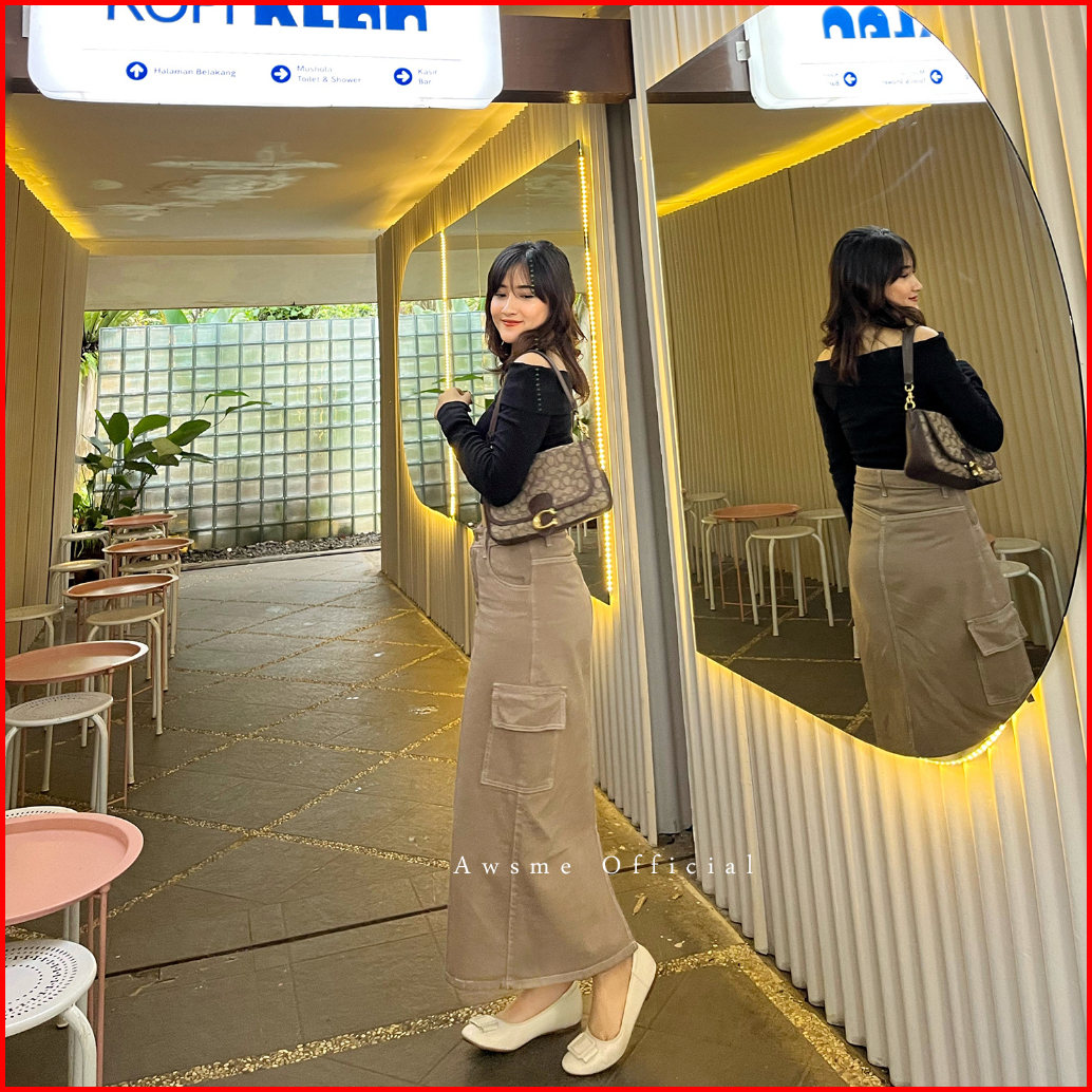Awsme - Rok Cargo Jeans Mocca Celana Wanita Denim Highwaist Midi Skirt