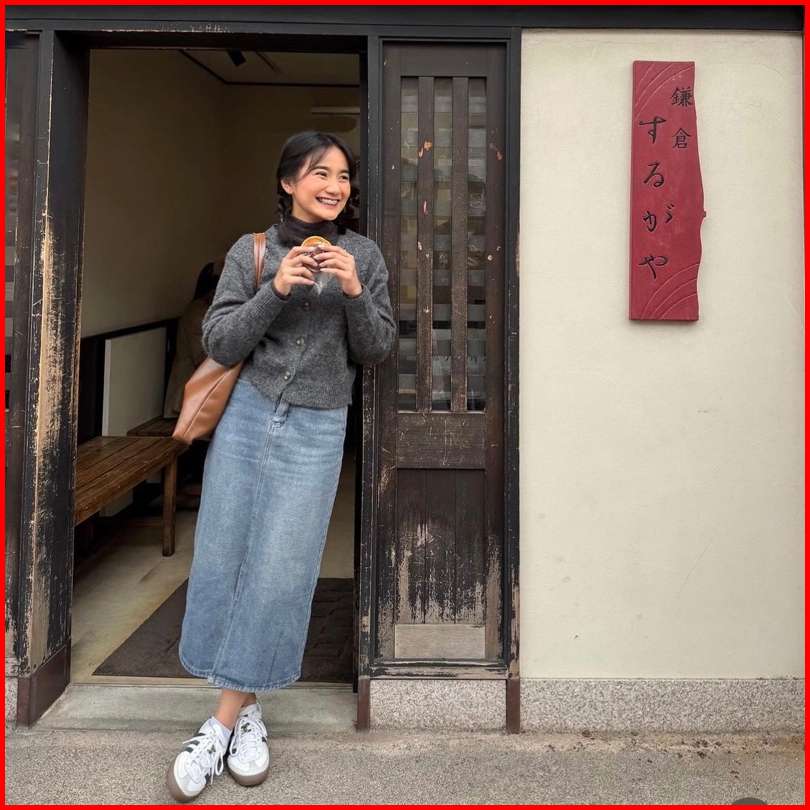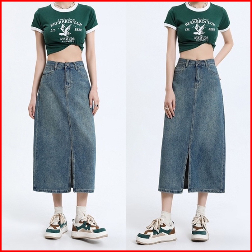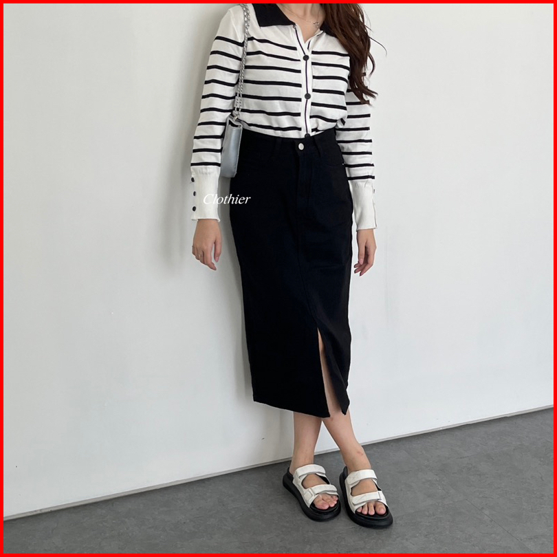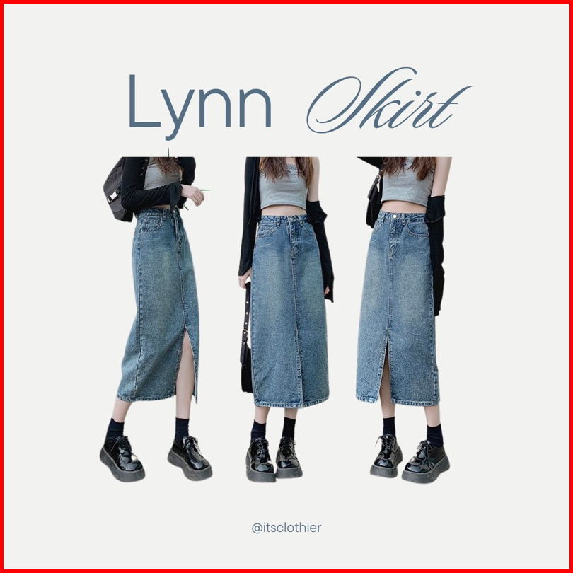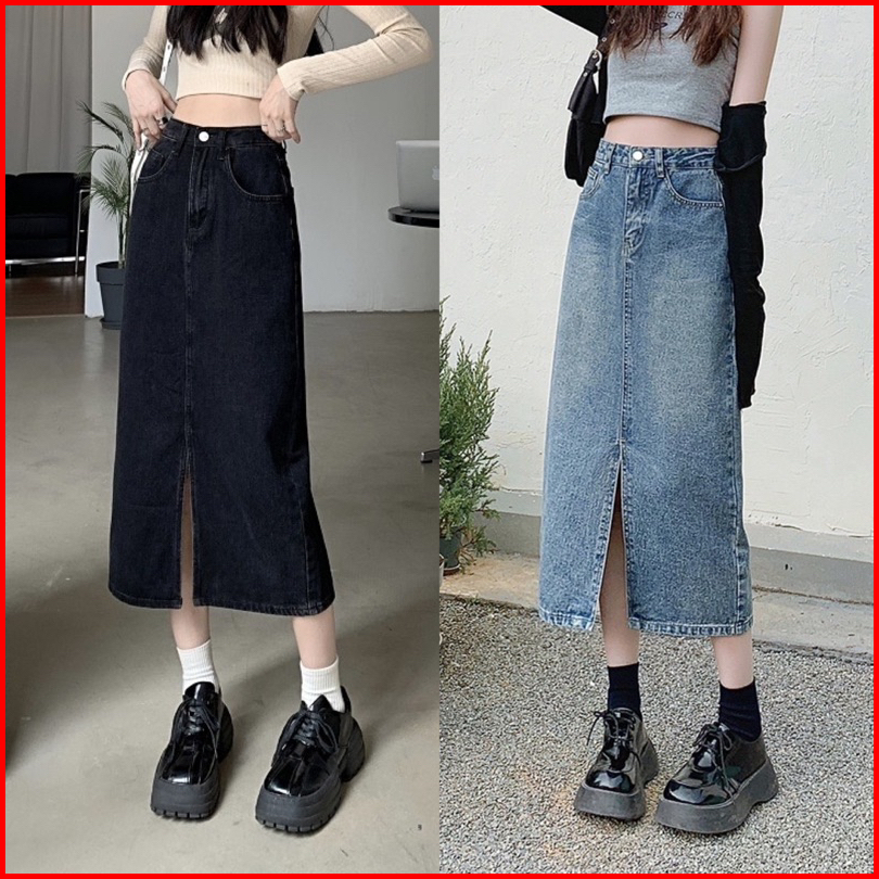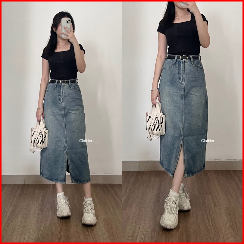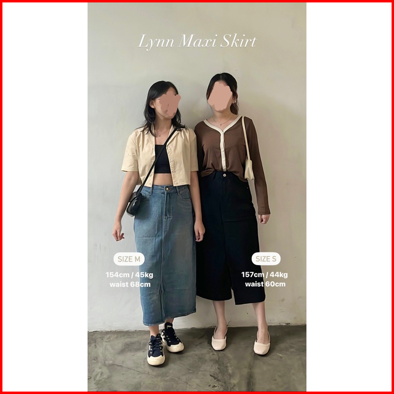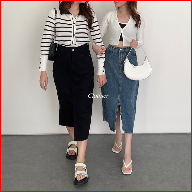 Clothier Lynn Slit Denim Skirt - Rok Panjang Midi Jeans Wanita Belahan Depan Hitam Aprikot