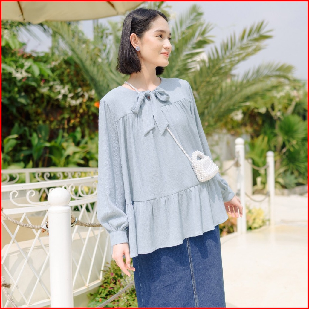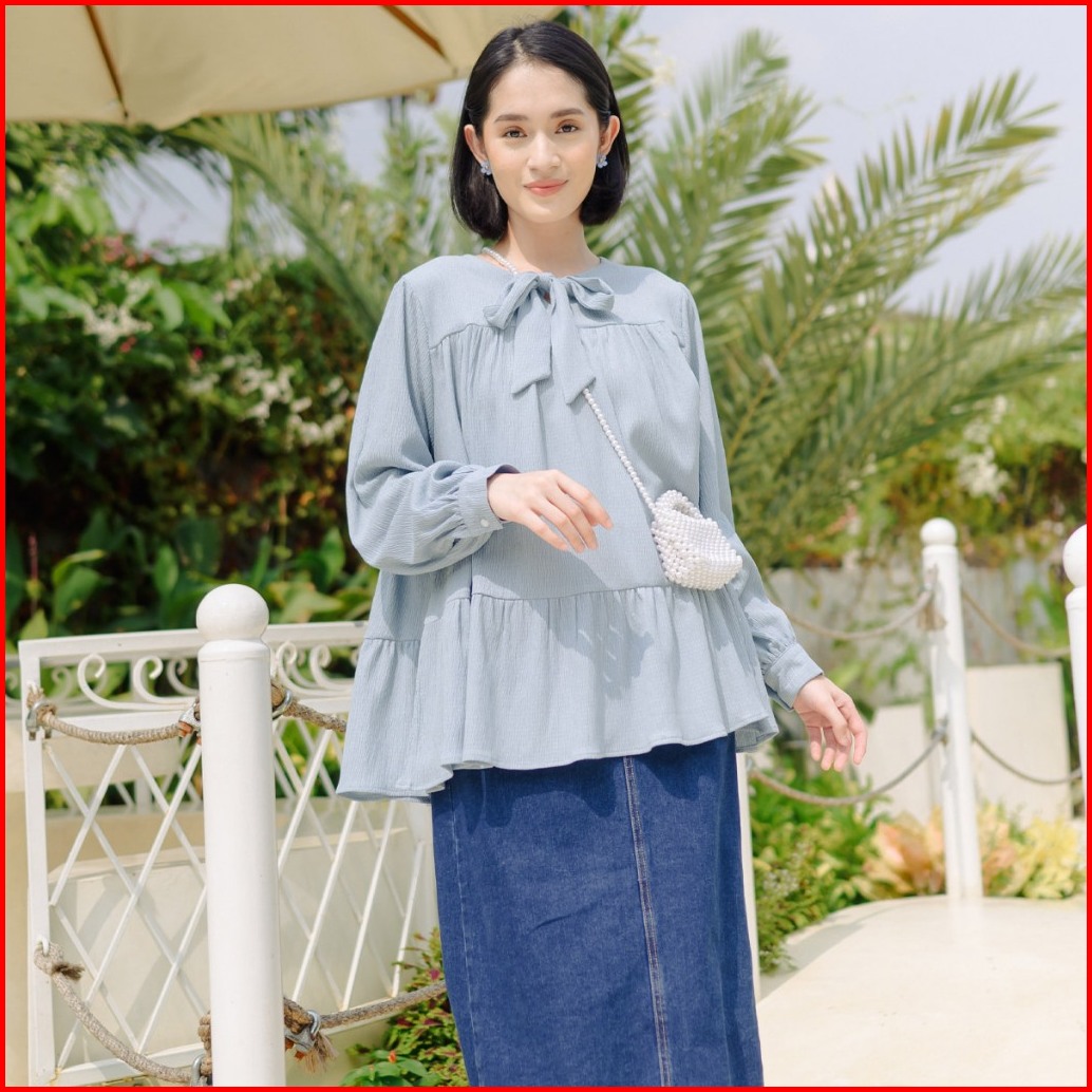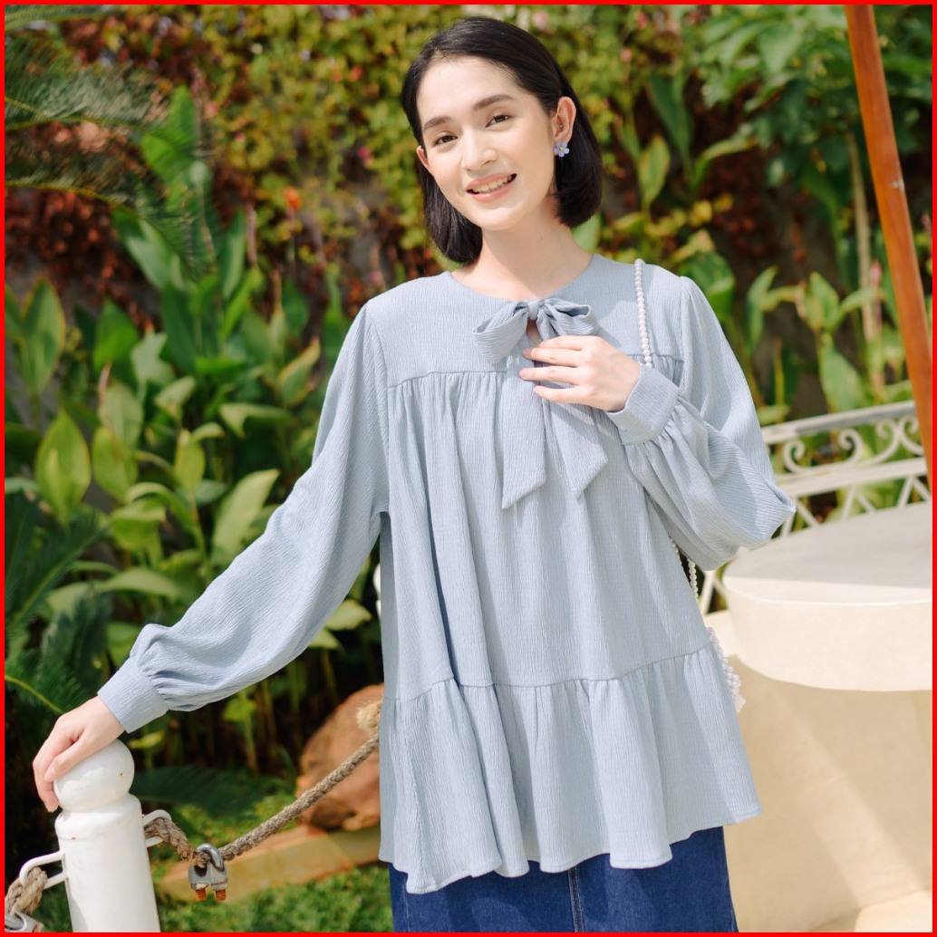 Hijabchic Ziana Blue Top - Blouse Muslim Crinkle Cantik Pita Girly Anti Kusut Terbaru