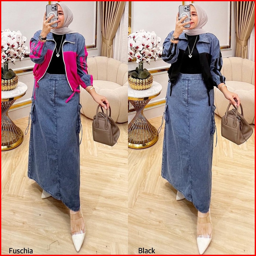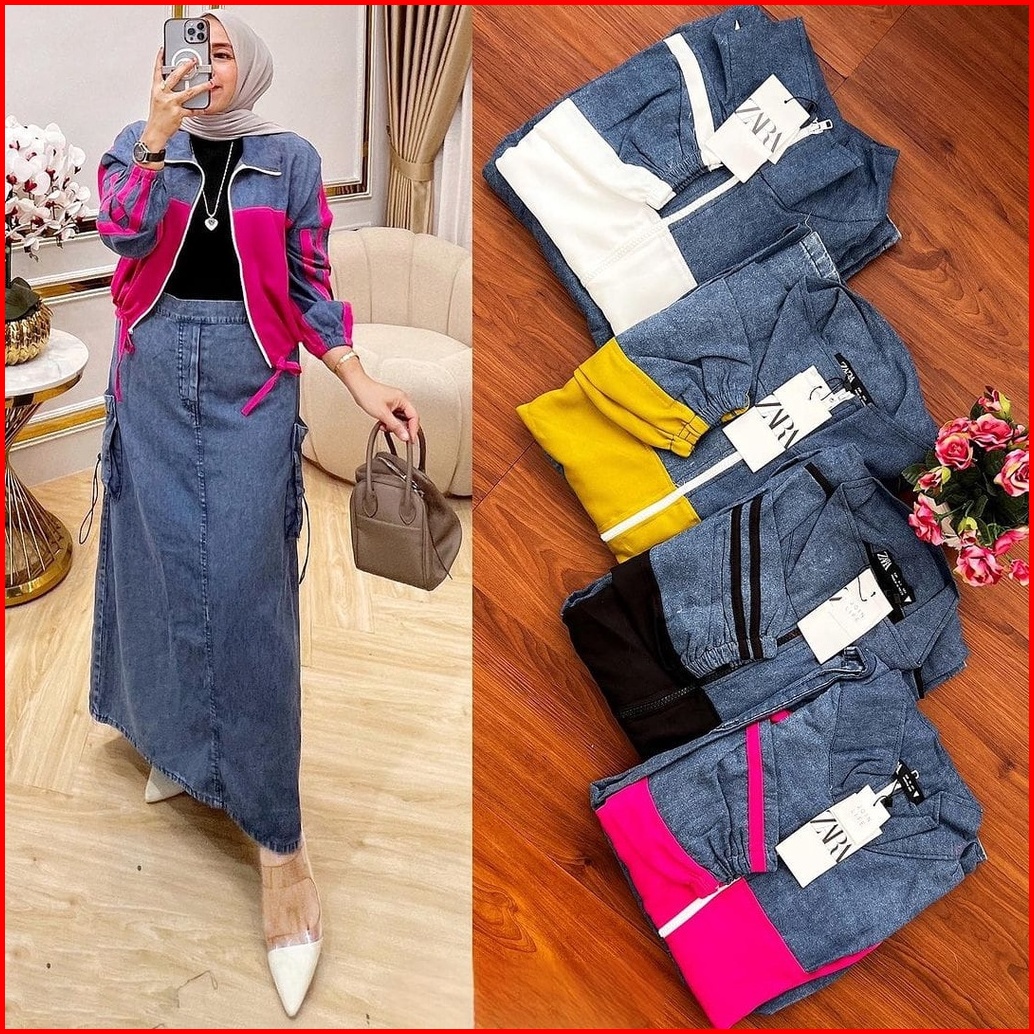 Vallina Outfit - Angeline One Set Zip Top Listed Jeans Mix Toyobo Baju Setelan Rok Wanita Muslim Modern Kekinian Premium