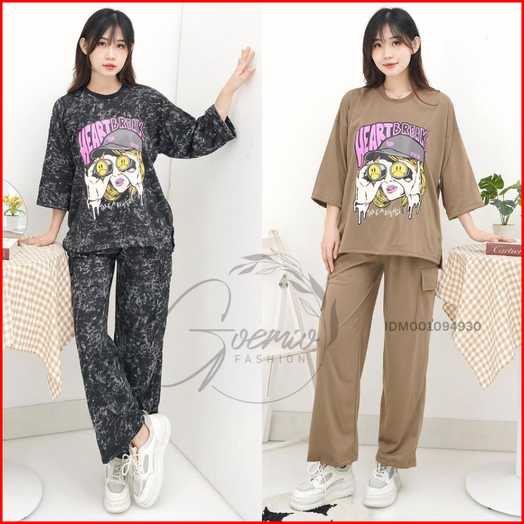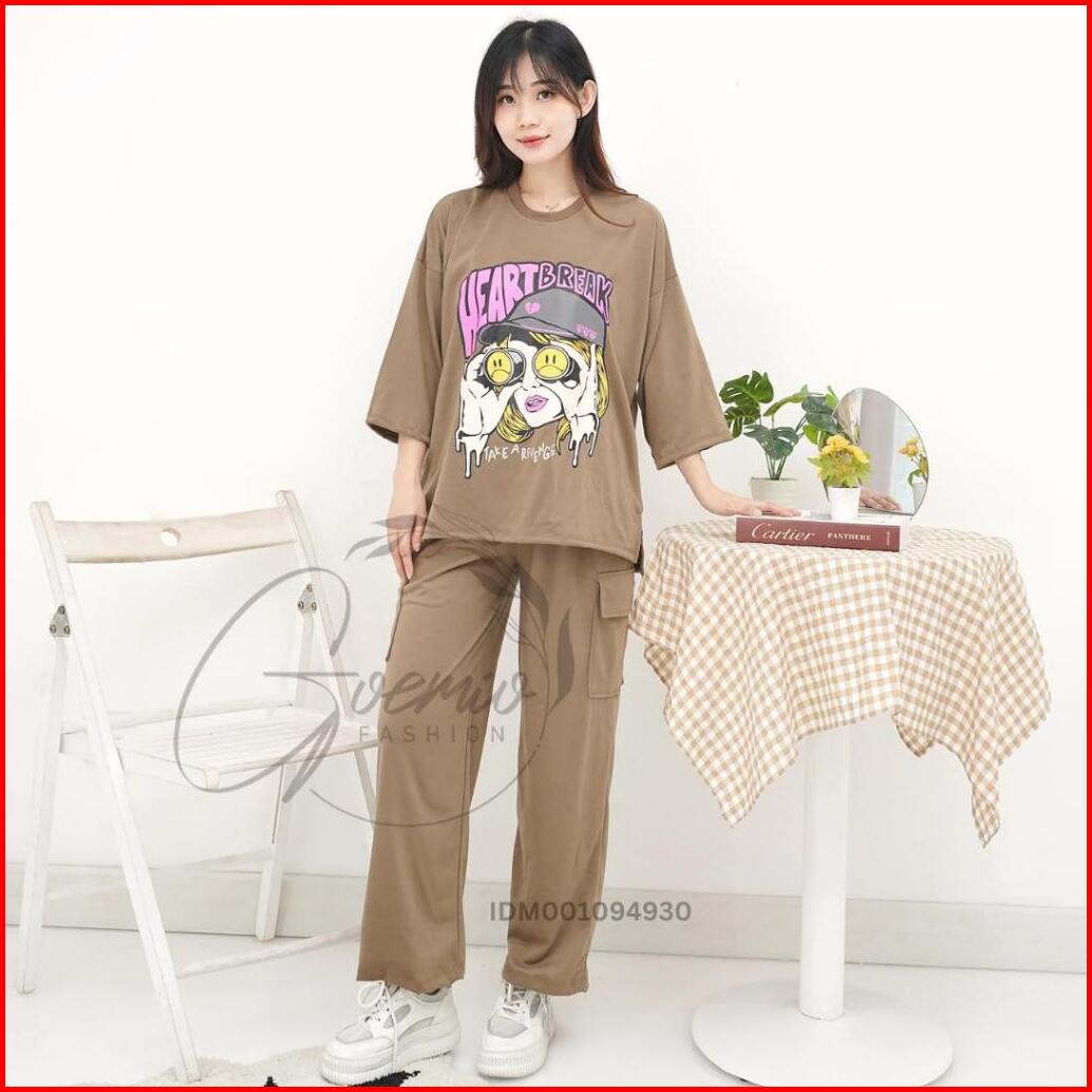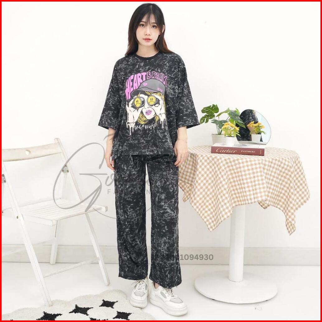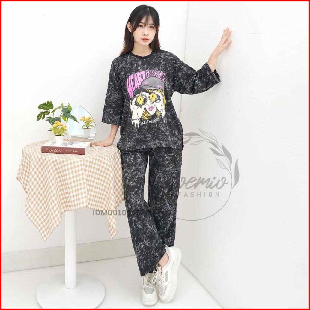 Ilook Ld 120 One Set Heart Break Setelan Katun Mini Atasan Motif Lengan Panjang Dan Celana Panjang Cargo Wanita Motif