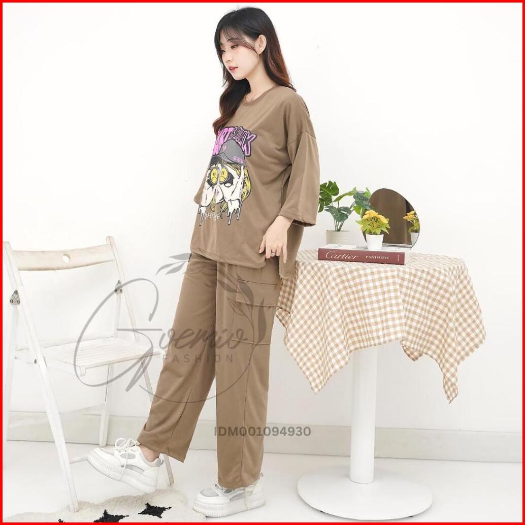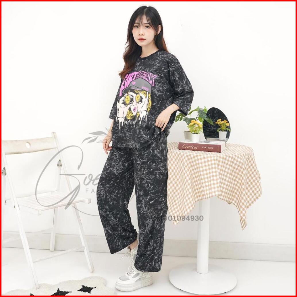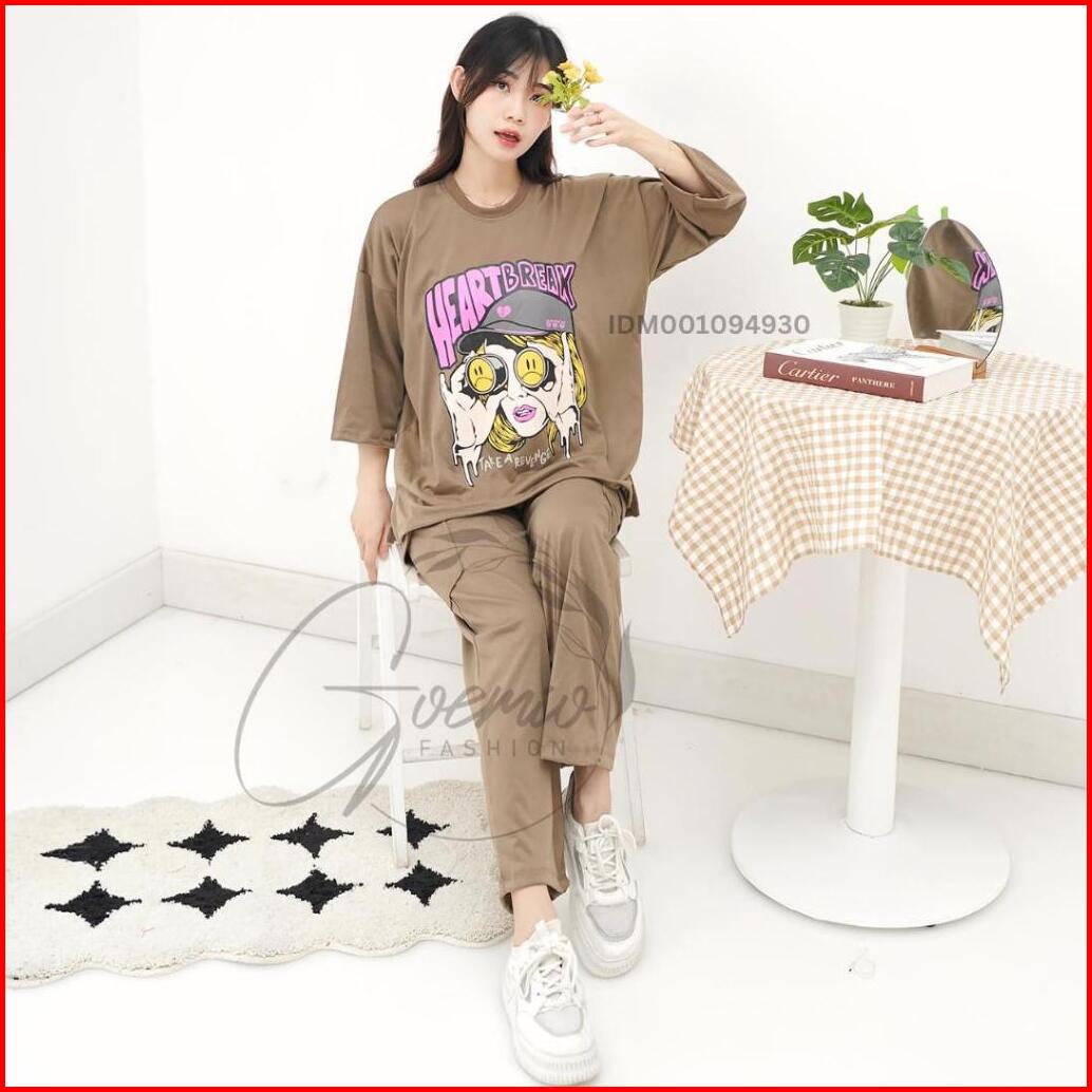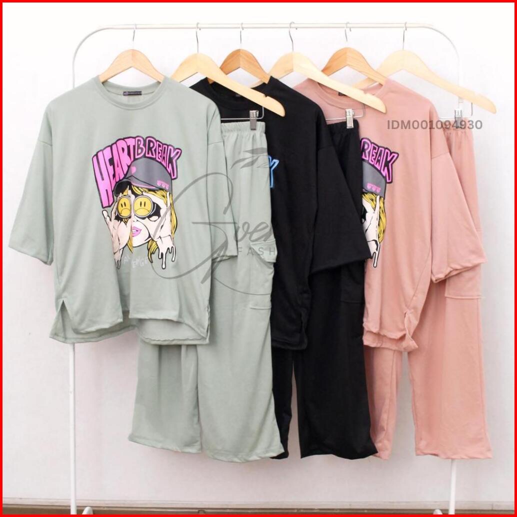 Ilook Ld 120 One Set Heart Break Setelan Katun Mini Atasan Motif Lengan Panjang Dan Celana Panjang Cargo Wanita Motif