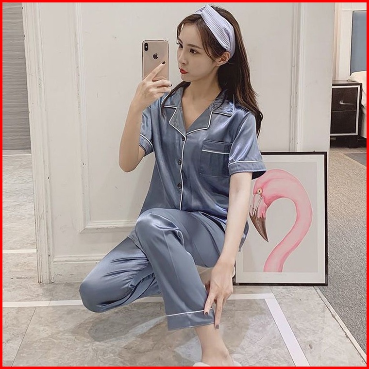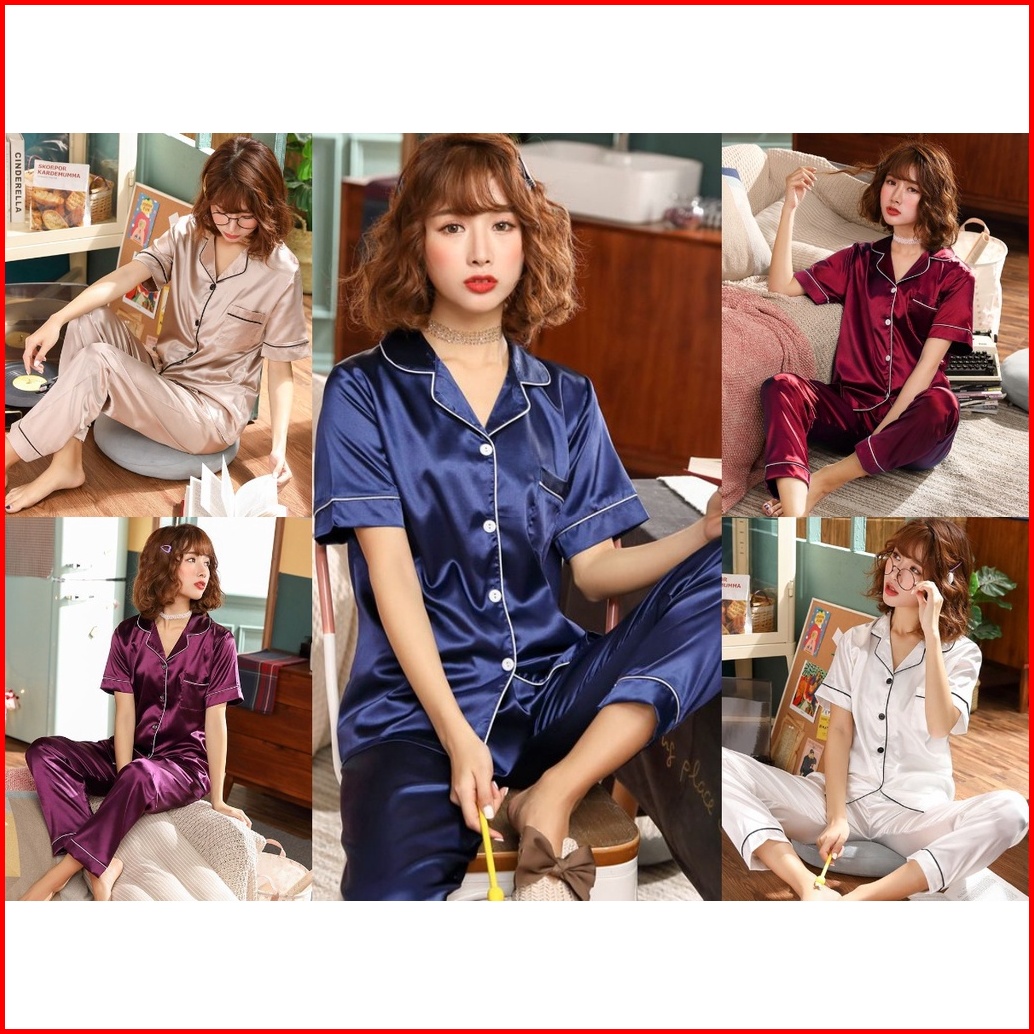 Lovera Set Baju Tidur Wanita Satin Model Kemeja Polos Cp Celana Panjang Lengan Pendek