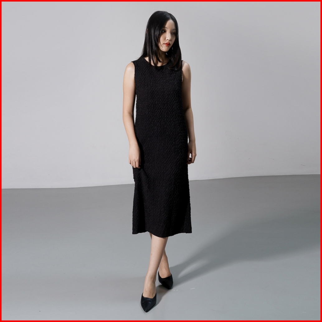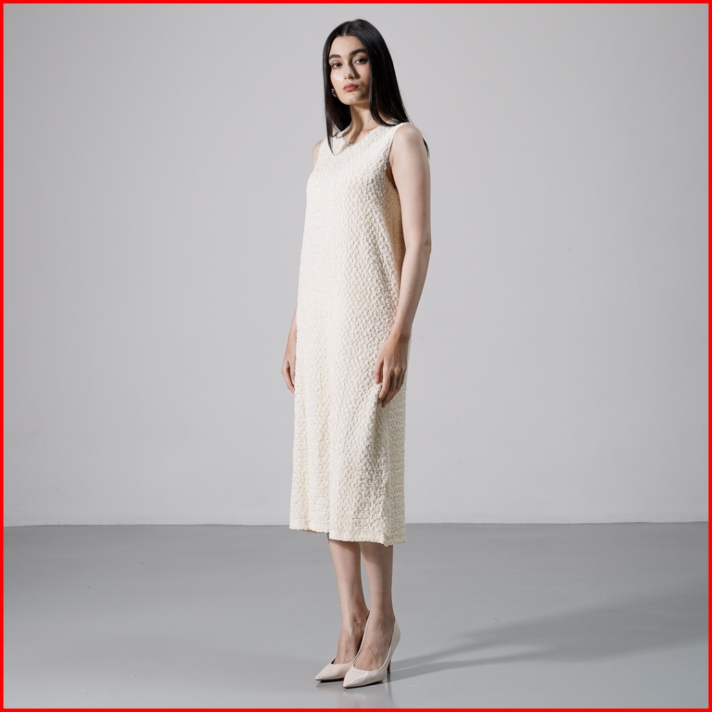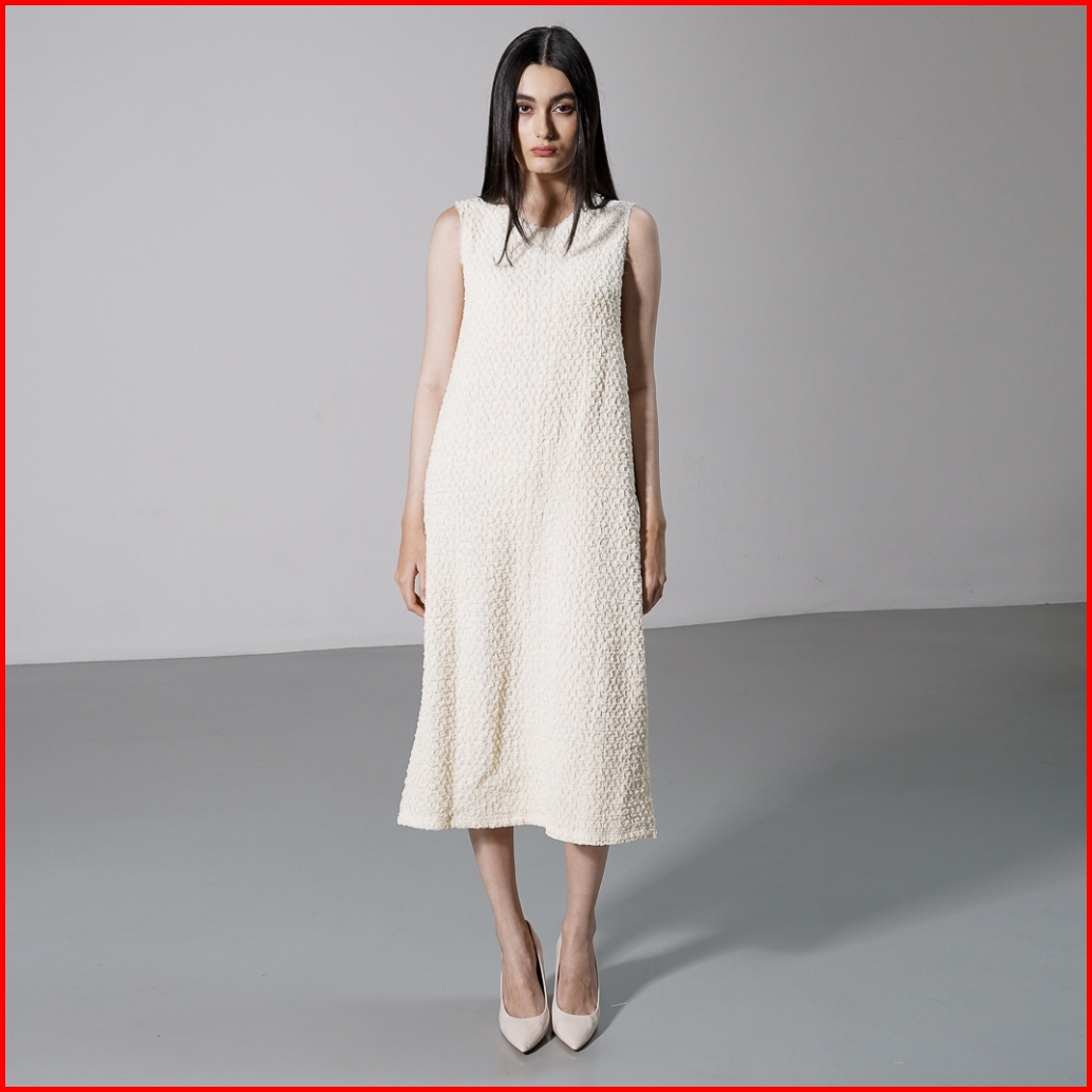 This Is April Gaun Wanita Midi Textured Tanpa Lengan Elegan Carolina Dress Ivory Dan Black Restock