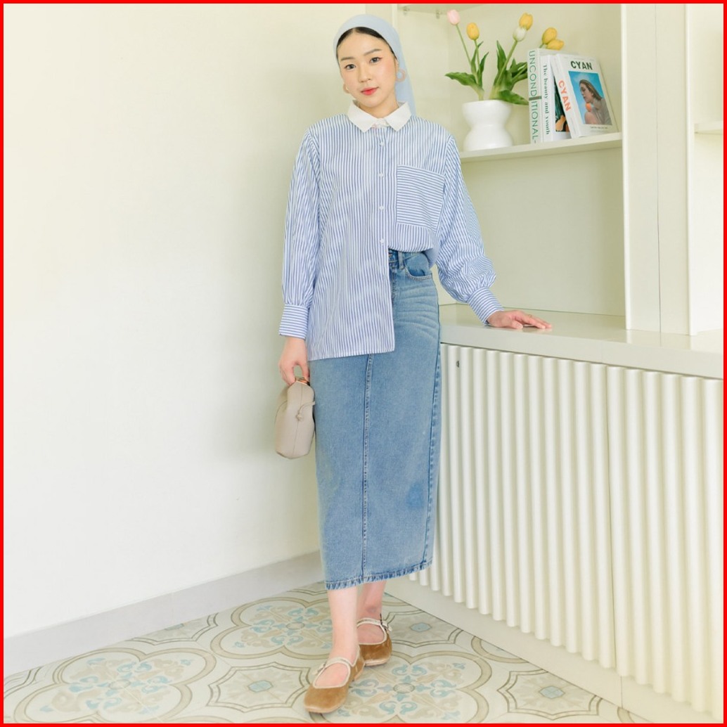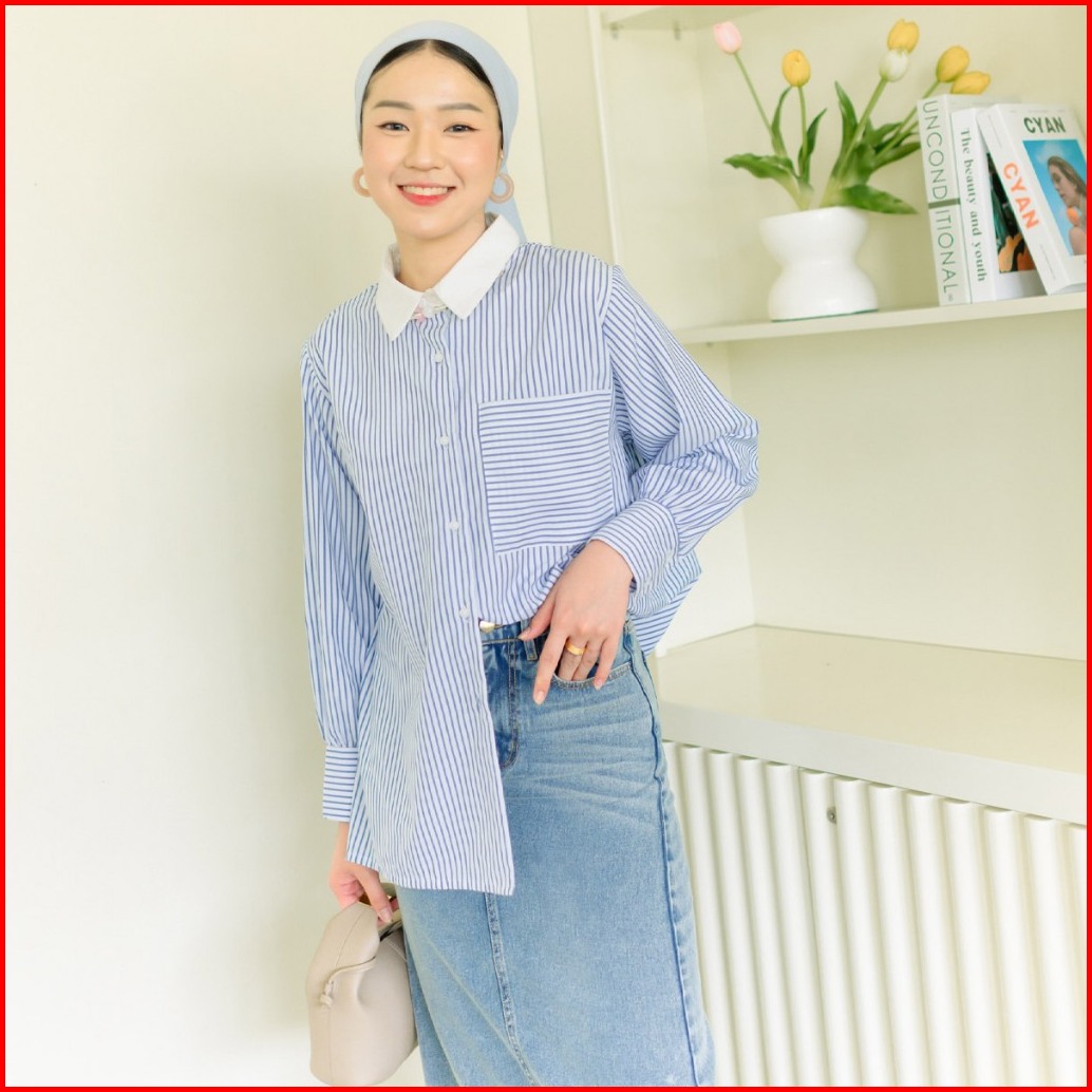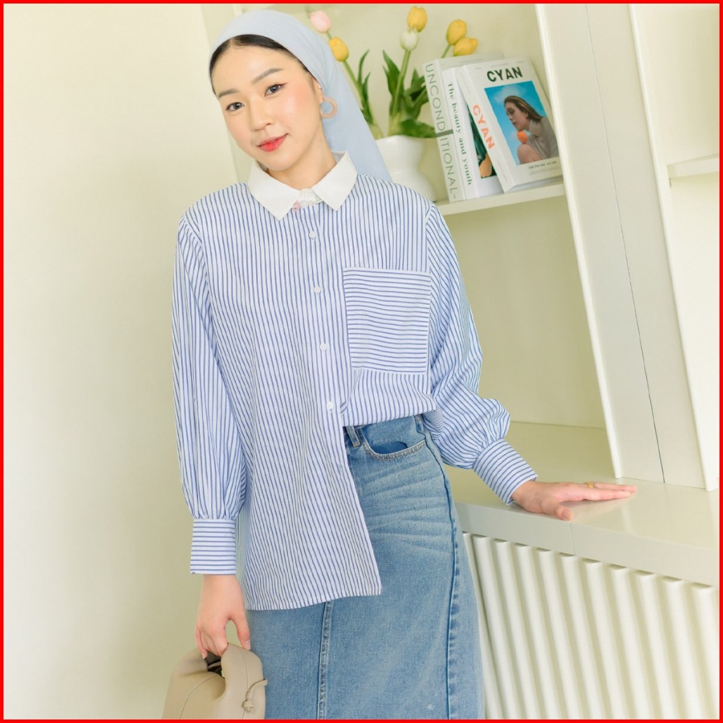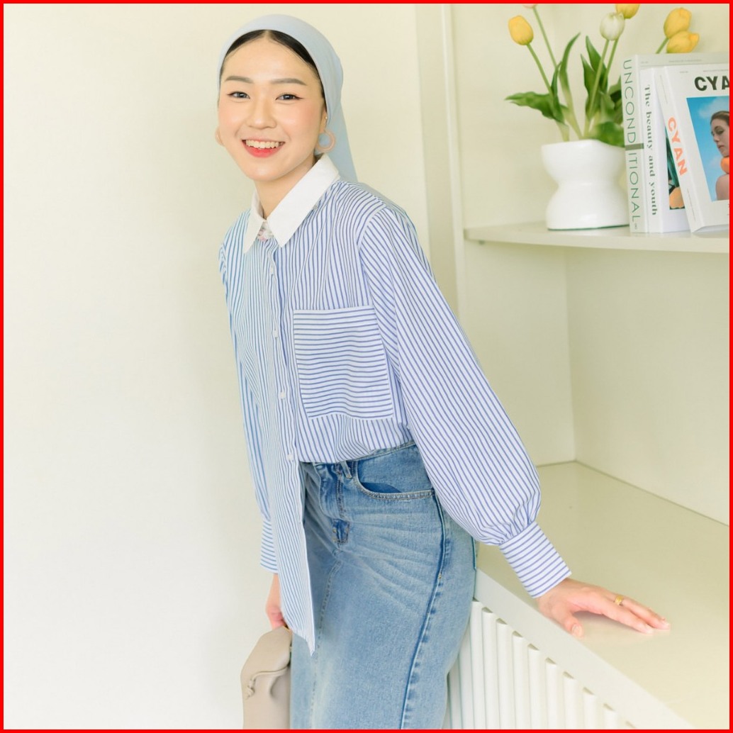 Hijabchic Tatiana Navy Stripe Top - Kemeja Muslim Stripe Cantik Lengan Pof Ramah Busui Terbaru