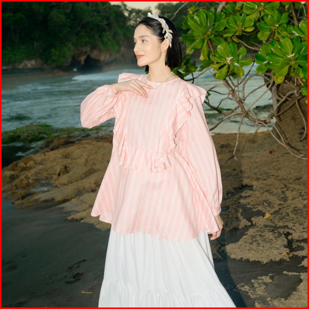 Hijabchic Zalina Blushing Peach Stripe Tops - Atasan Wanita Muslim Ruffle Cantik Best Seller Terbaru