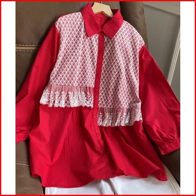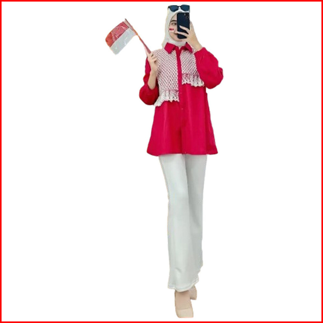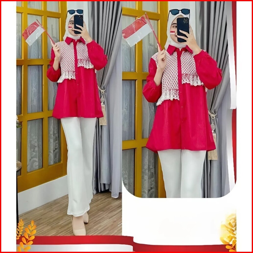 Vallina Outfit - Kirana Blouse Atasan Merah Putih Matt Katun Mix Brukat Premium Ootd Wanita Muslim Kemerdekaan