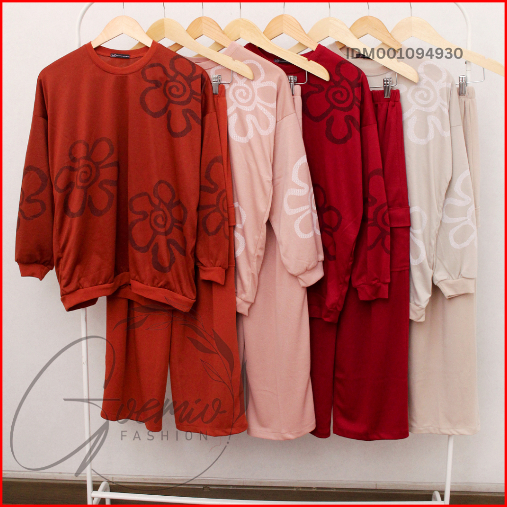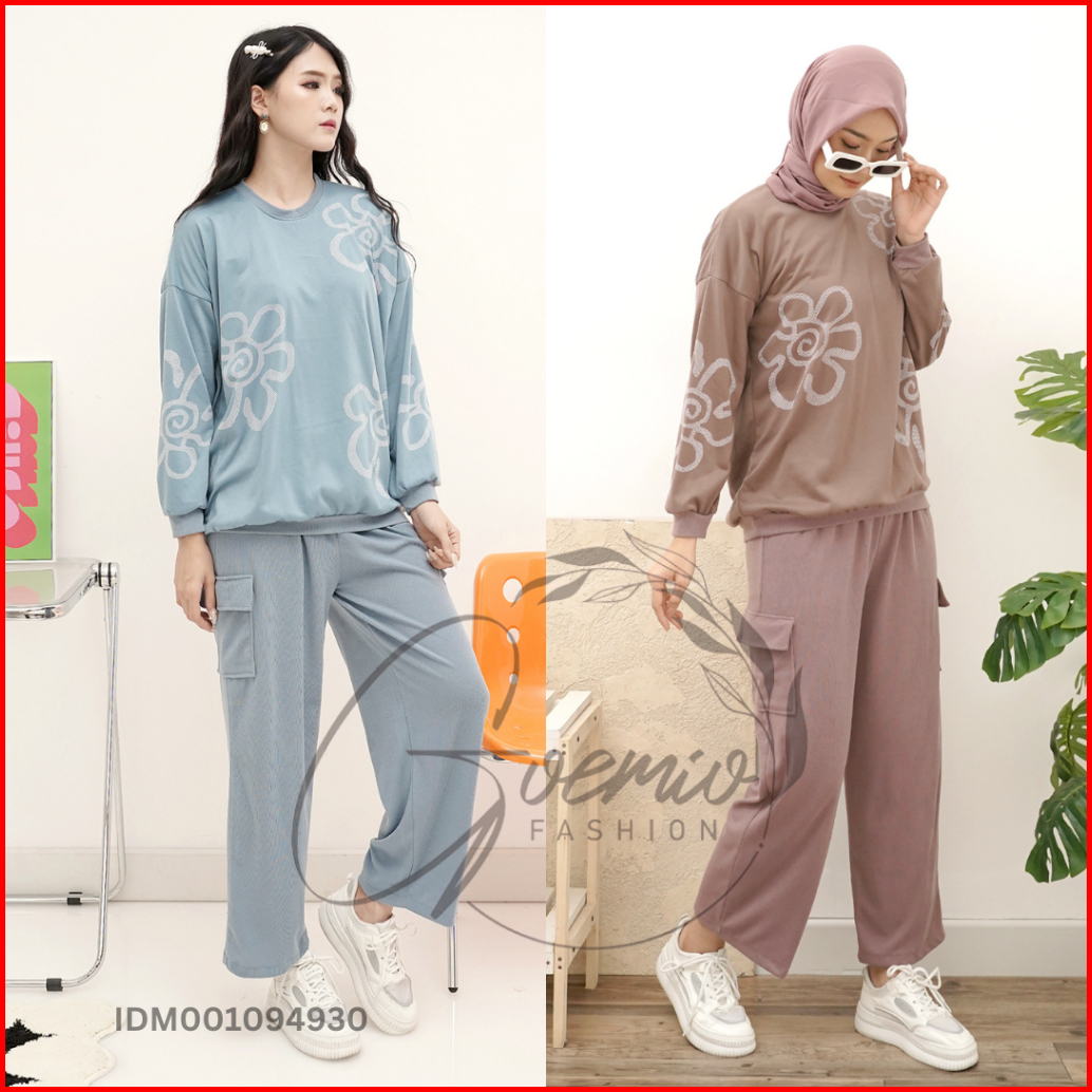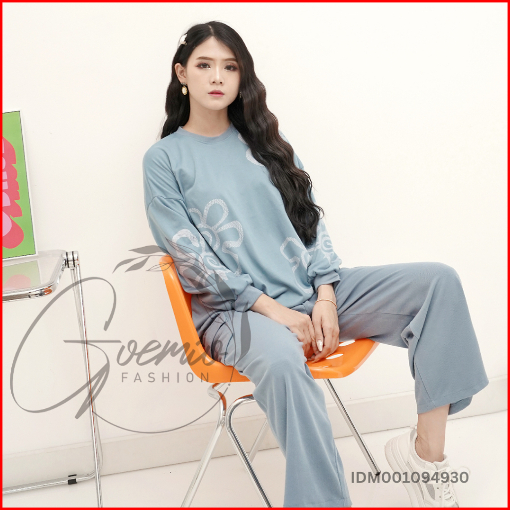 Ilook Ld 120 One Set Daisy Setelan Katun Knit Combi Atasan Motif Bunga Lengan Panjang Dan Celana Panjang Wanita